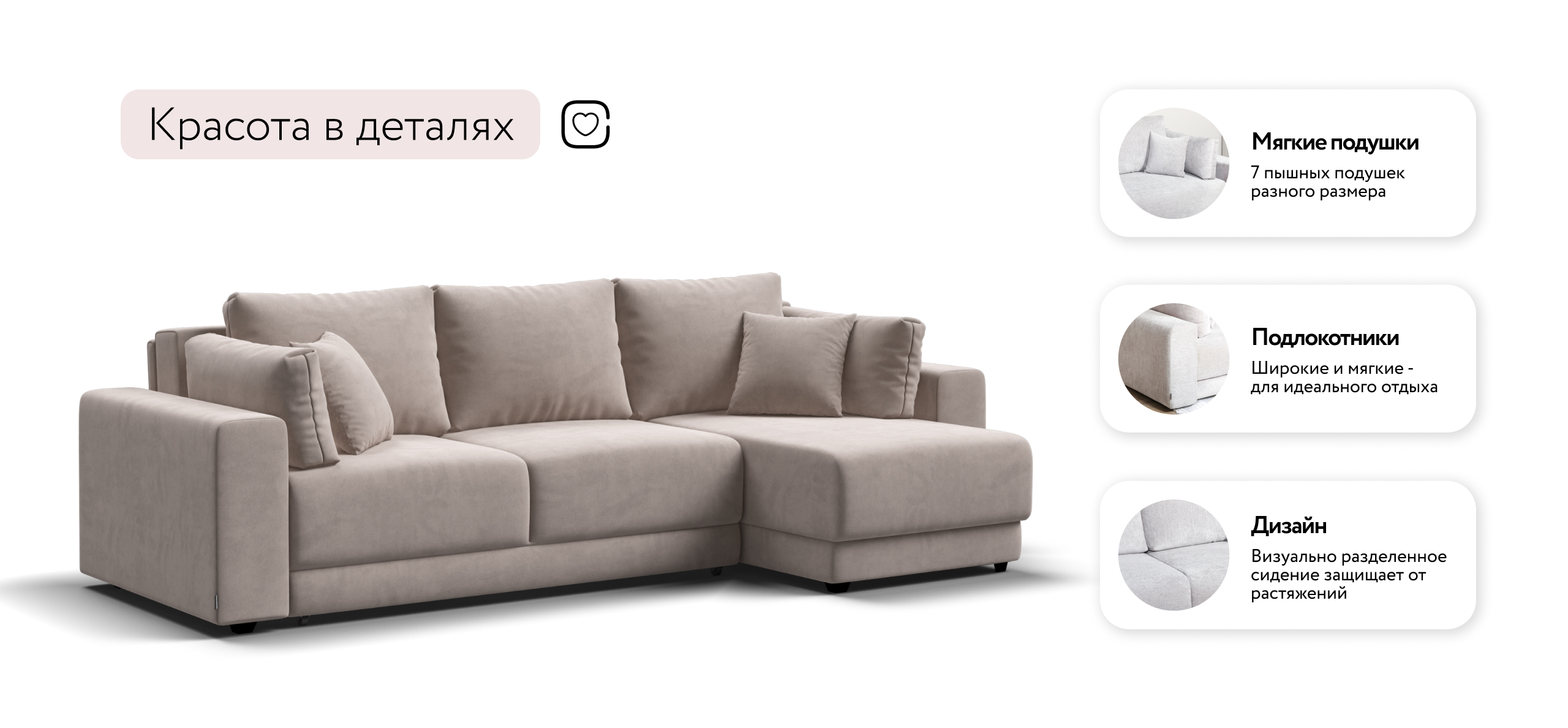 Угловой диван Босс Прайм ХЛ - это сочетание современного дизайна и продуманной эргономики, создающее уютную атмосферу в любом интерьере. Визуально разделённое сиденье, широкие мягкие подлокотники и пышные подушки разного размера обеспечивают не только эстетическую привлекательность, но и максимальный комфорт.