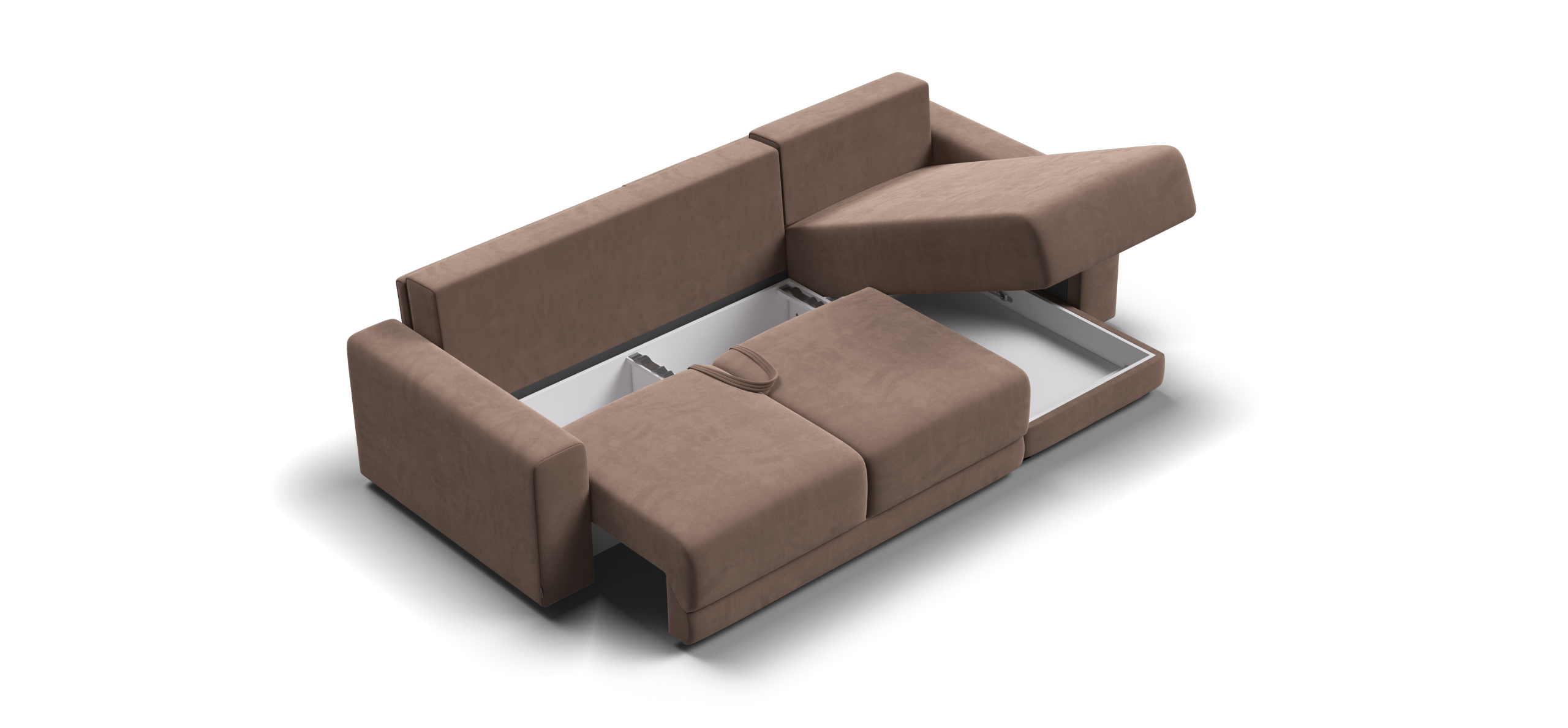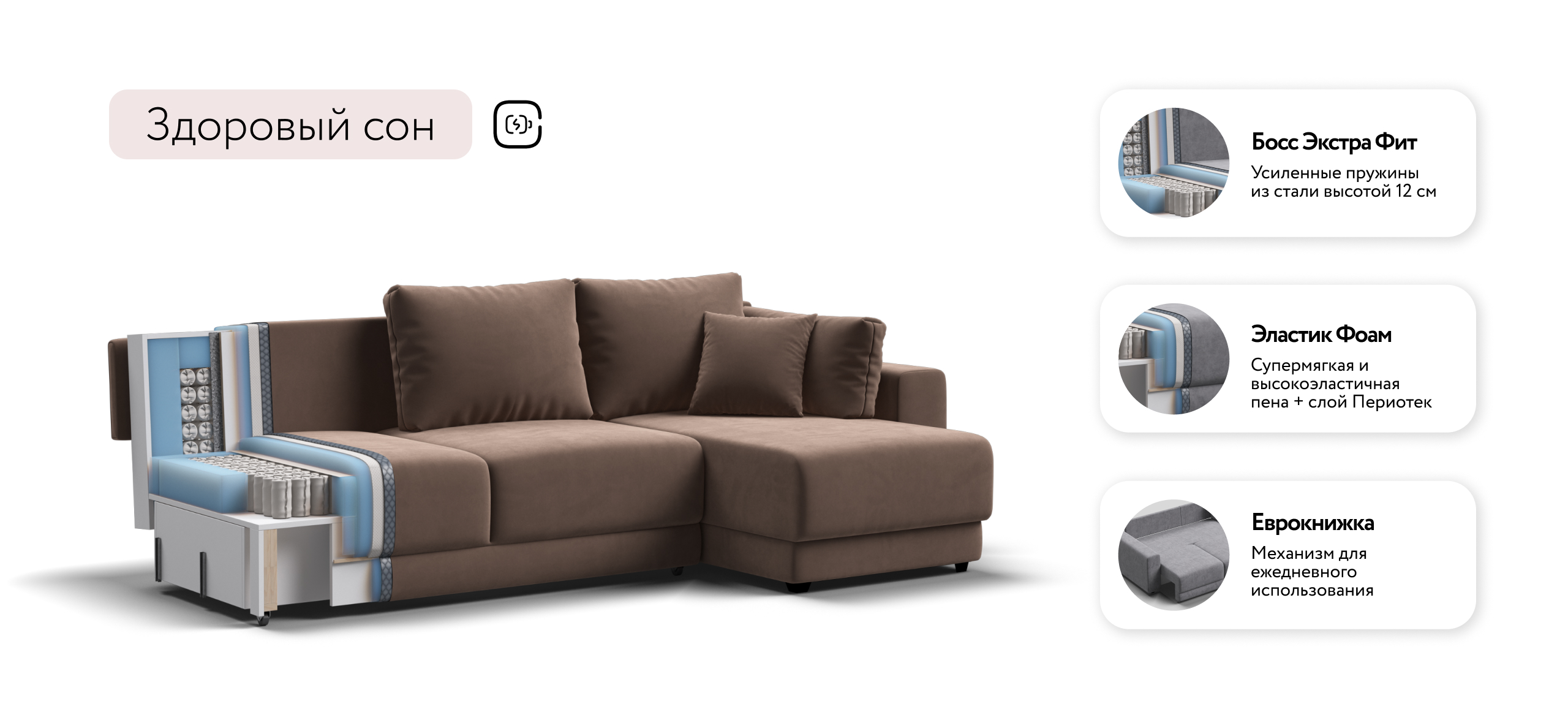Оснащённый независимым пружинным блоком и высокоэластичной пеной Эластик Фоам с дополнительным слоем периотека, диван гарантирует анатомическую поддержку и комфортный сон. Простой и надёжный механизм трансформации «еврокнижка» позволяет легко преобразовать диван в просторное спальное место. Универсальный угол позволит Вам переставить оттоманку и поменять положение угла при необходимости.