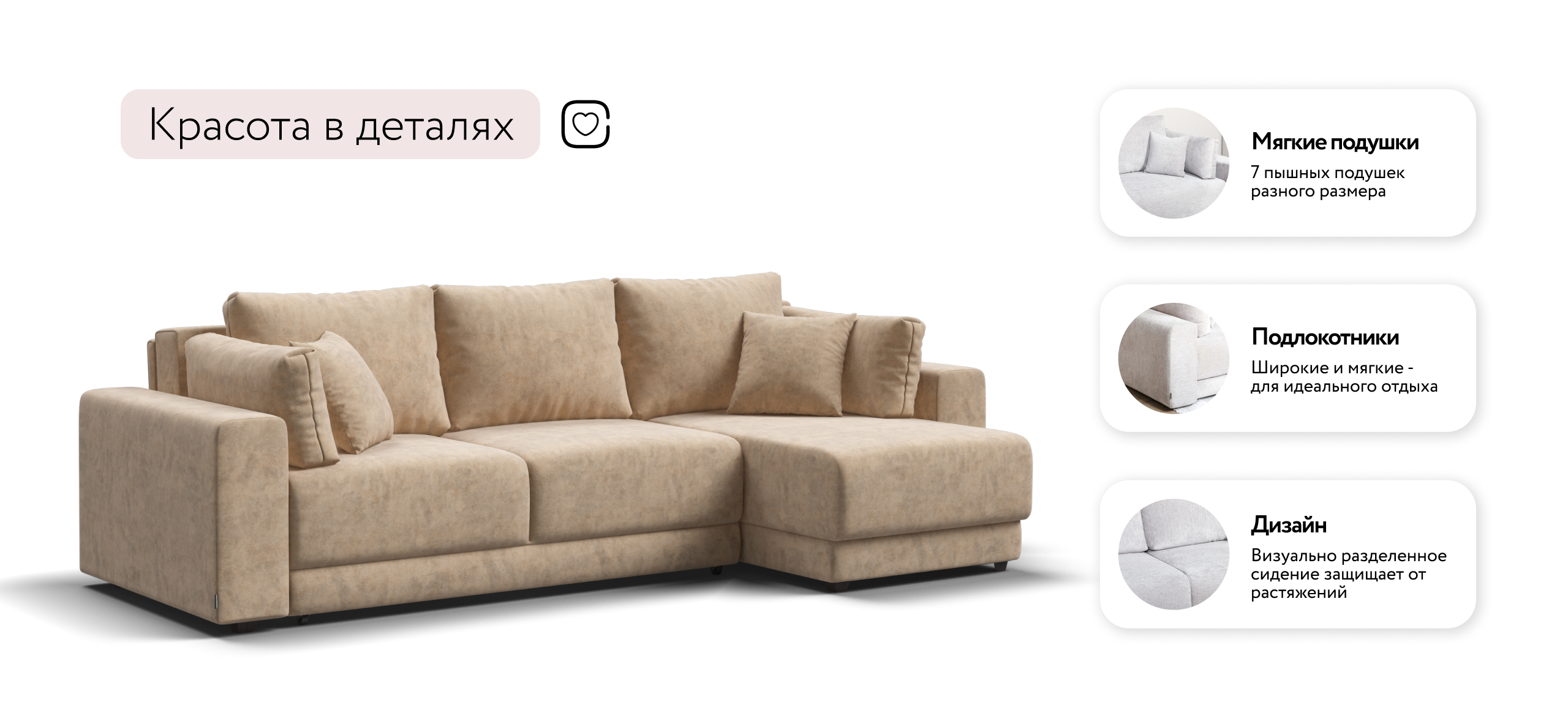 Угловой диван Босс Прайм ХЛ - это сочетание современного дизайна и продуманной эргономики, создающее уютную атмосферу в любом интерьере. Визуально разделённое сиденье, широкие мягкие подлокотники и пышные подушки разного размера обеспечивают не только эстетическую привлекательность, но и максимальный комфорт.​