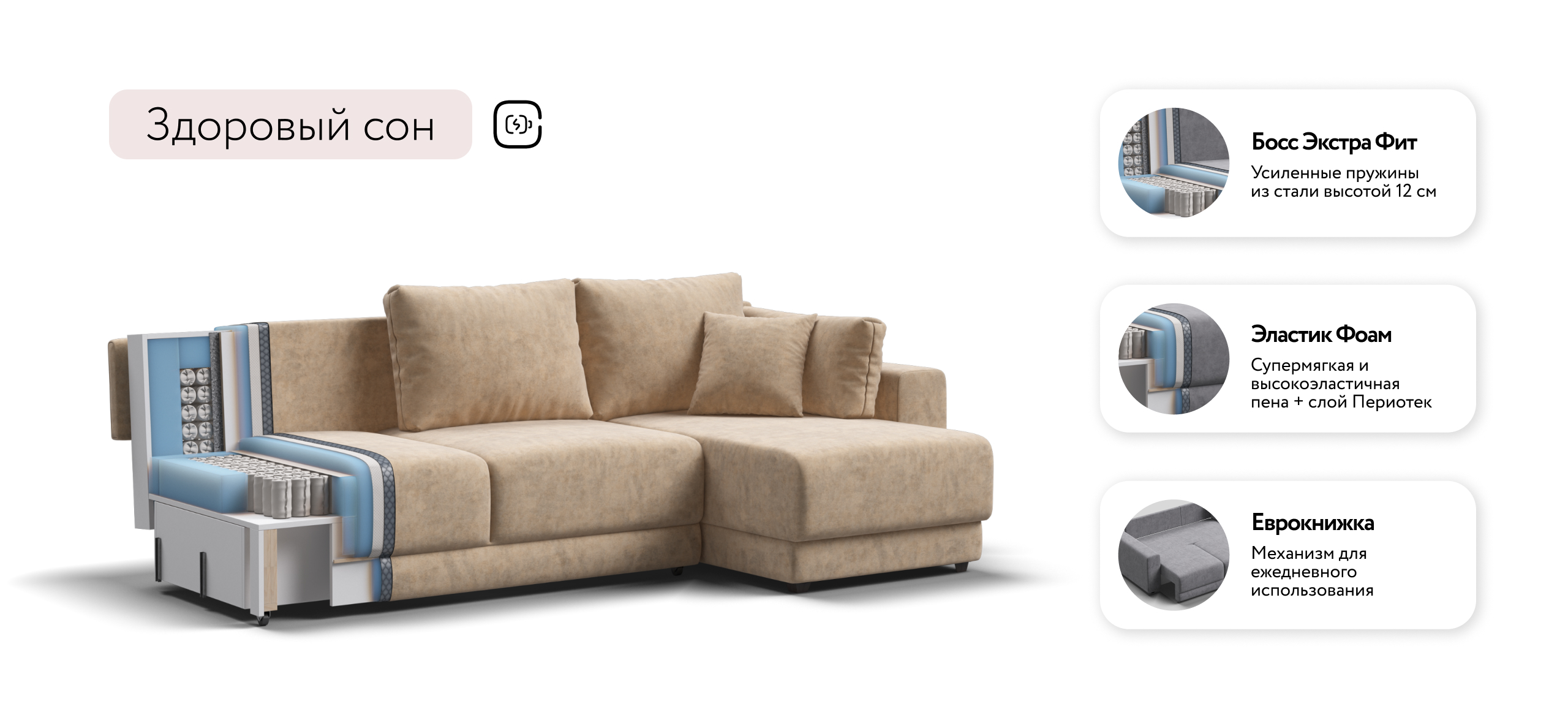 Оснащённый независимым пружинным блоком и высокоэластичной пеной Эластик Фоам с дополнительным слоем периотека, диван гарантирует анатомическую поддержку и комфортный сон. Простой и надёжный механизм трансформации «еврокнижка» позволяет легко преобразовать диван в просторное спальное место.​ Универсальный угол позволит Вам переставить оттоманку и поменять положение угла при необходимости.