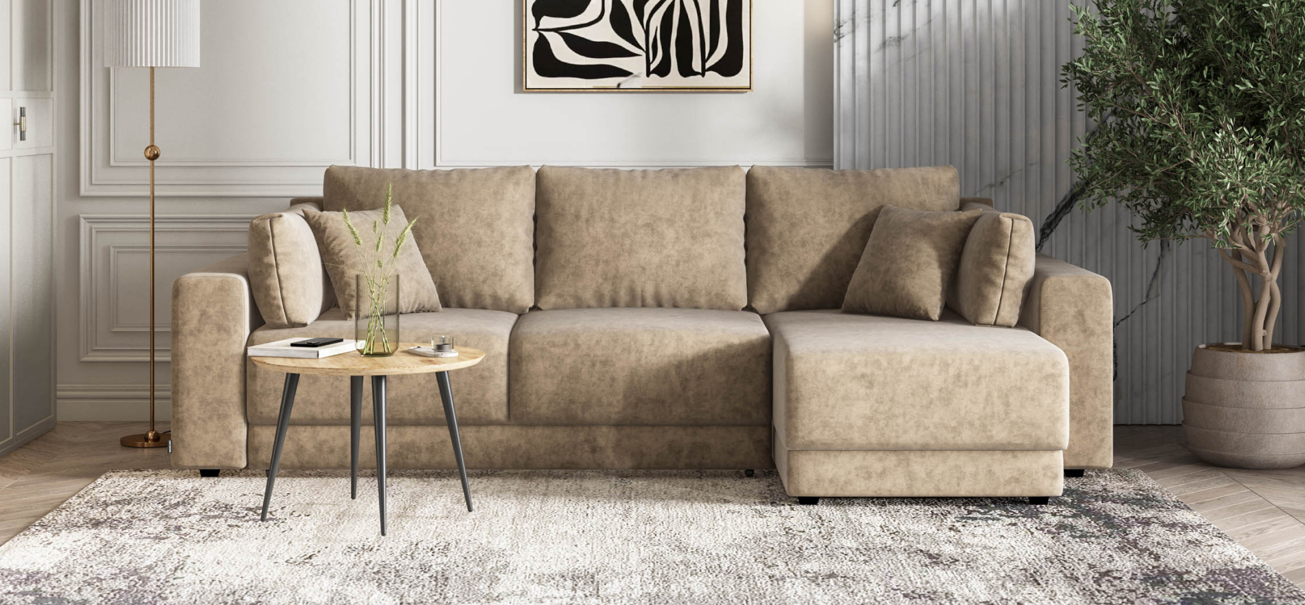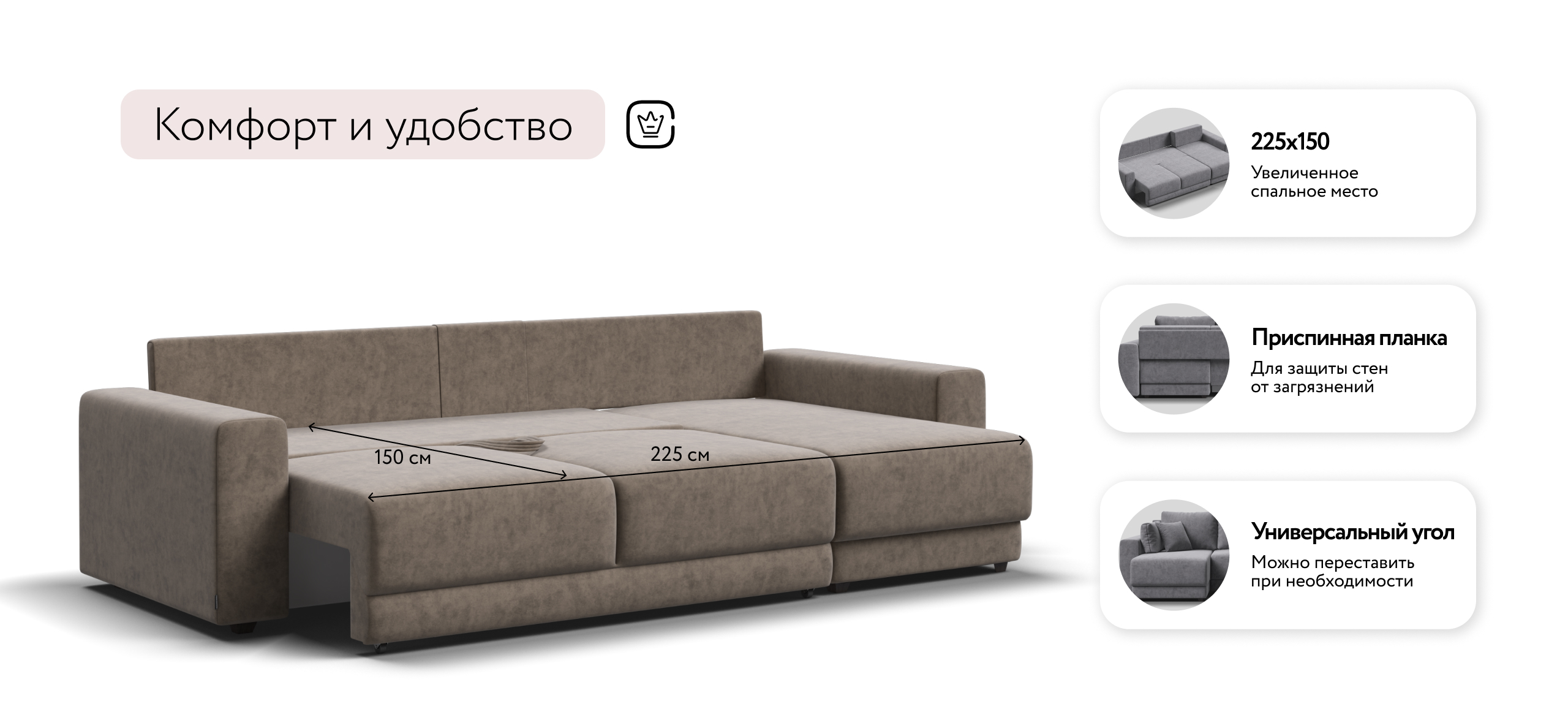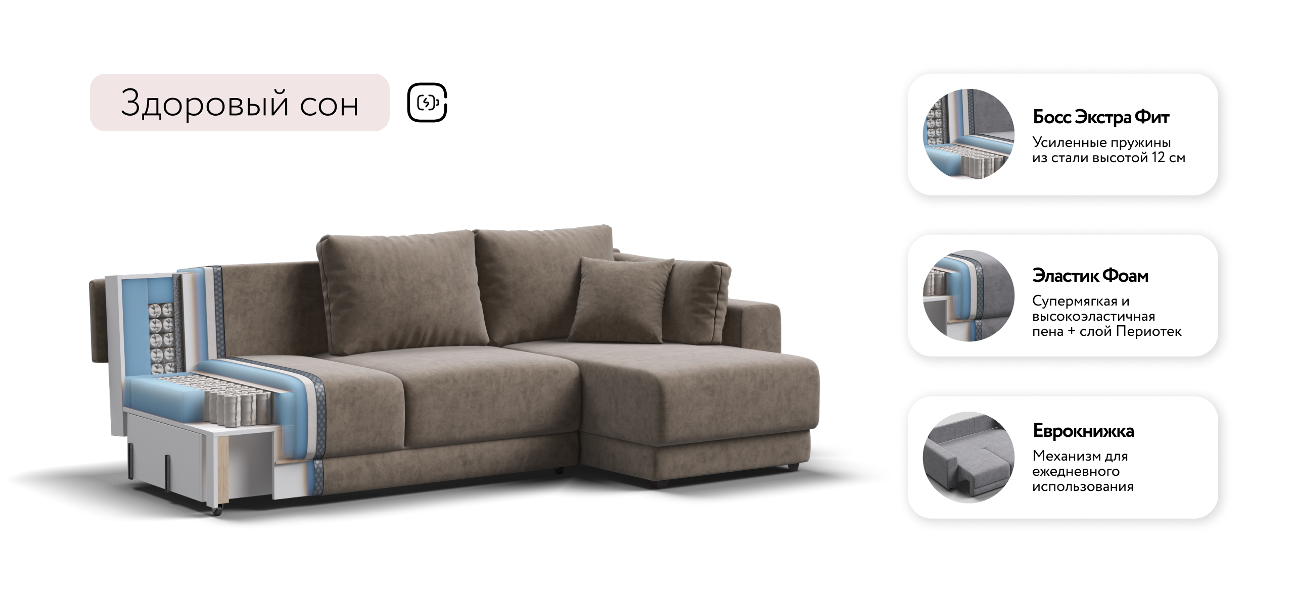 Оснащённый независимым пружинным блоком и высокоэластичной пеной Эластик Фоам с дополнительным слоем периотека, диван гарантирует анатомическую поддержку и комфортный сон. Простой и надёжный механизм трансформации «еврокнижка» позволяет легко преобразовать диван в просторное спальное место.​ Универсальный угол позволит Вам переставить оттоманку и поменять положение угла при необходимости.