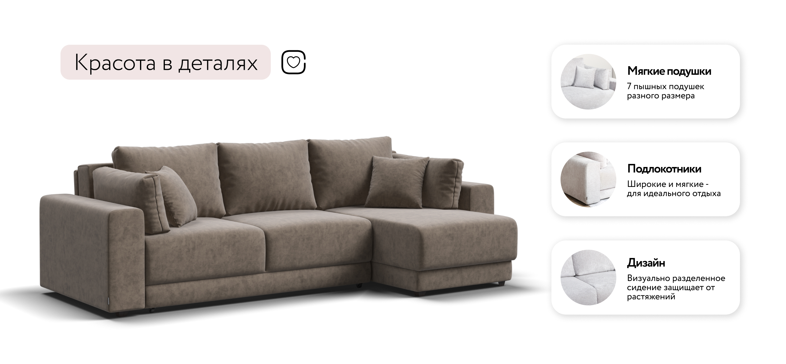 Угловой диван Босс Прайм ХЛ - это сочетание современного дизайна и продуманной эргономики, создающее уютную атмосферу в любом интерьере. Визуально разделённое сиденье, широкие мягкие подлокотники и пышные подушки разного размера обеспечивают не только эстетическую привлекательность, но и максимальный комфорт.​