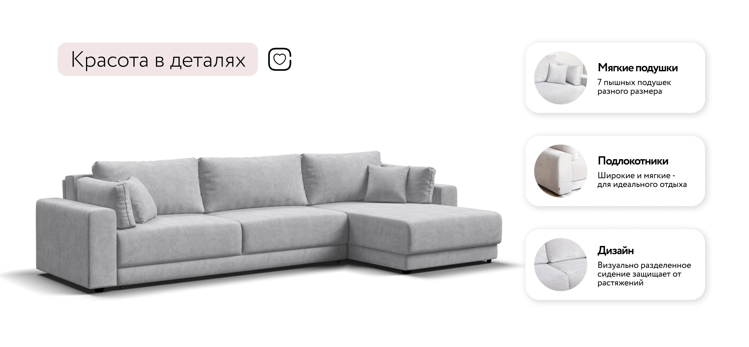Угловой диван Босс Прайм Макс - это сочетание современного дизайна и продуманной эргономики, создающее уютную атмосферу в любом интерьере. Визуально разделённое сиденье, широкие мягкие подлокотники и пышные подушки разного размера обеспечивают не только эстетическую привлекательность, но и максимальный комфорт.
