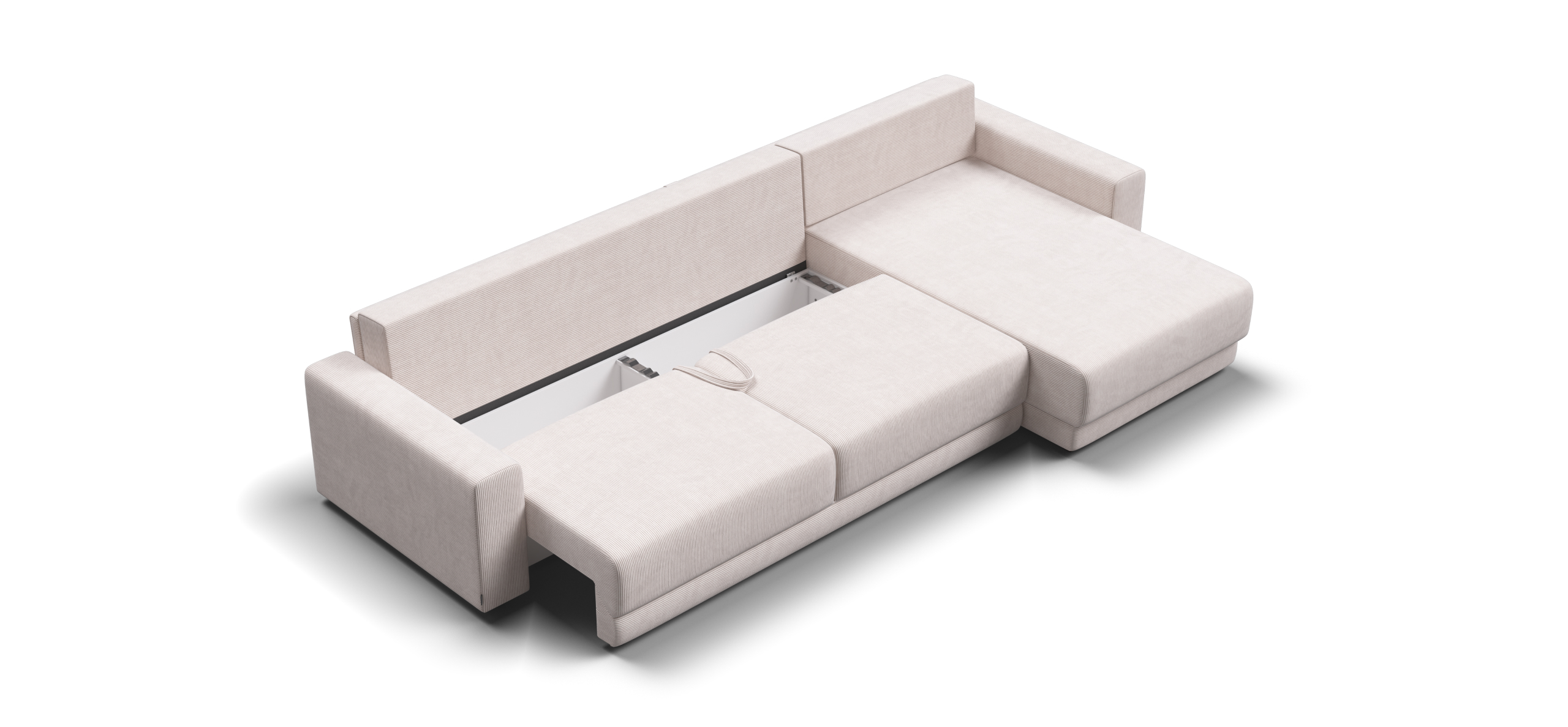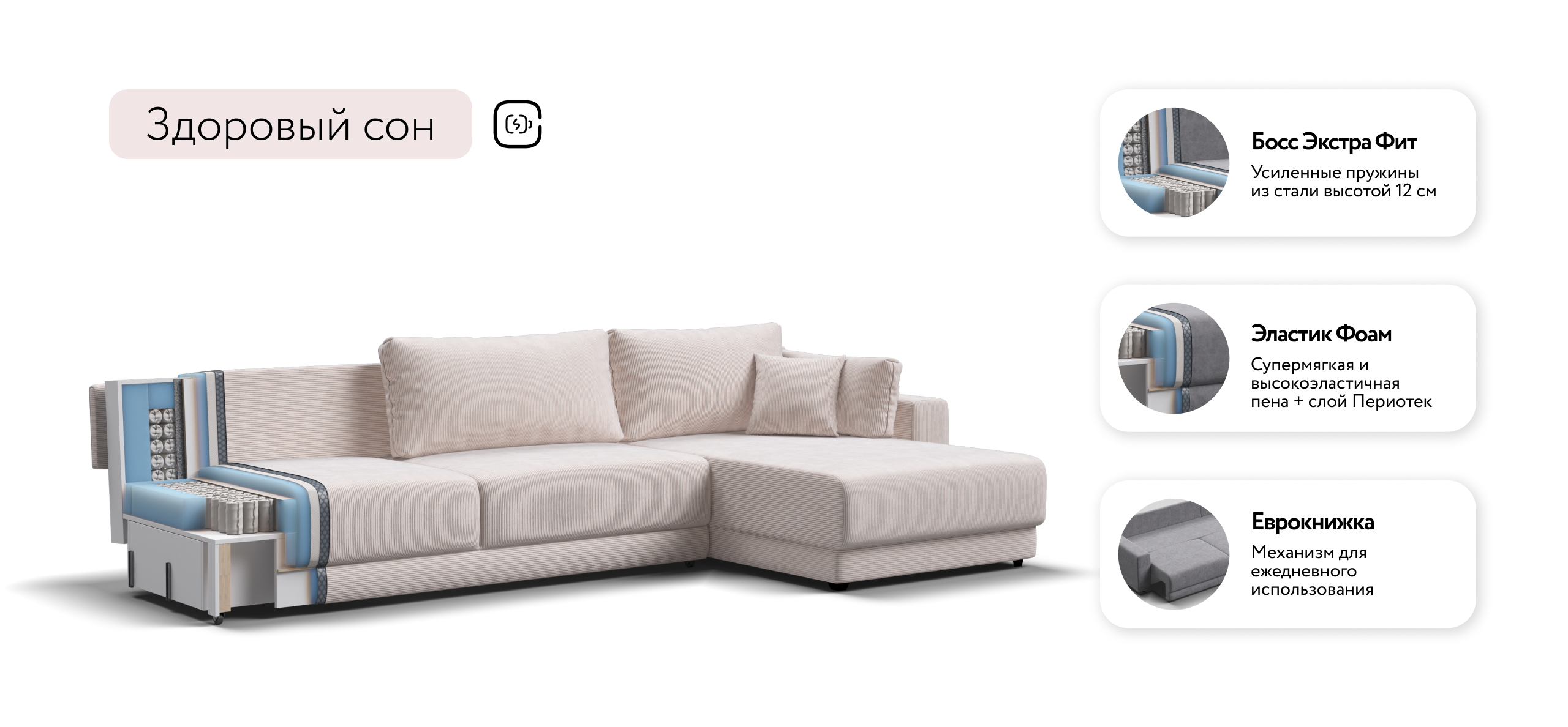 Оснащённый независимым пружинным блоком и высокоэластичной пеной Эластик Фоам с дополнительным слоем периотека, диван гарантирует анатомическую поддержку и комфортный сон. Простой и надёжный механизм трансформации «еврокнижка» позволяет легко преобразовать диван в просторное спальное место. Универсальный угол позволит Вам переставить оттоманку и поменять положение угла при необходимости.