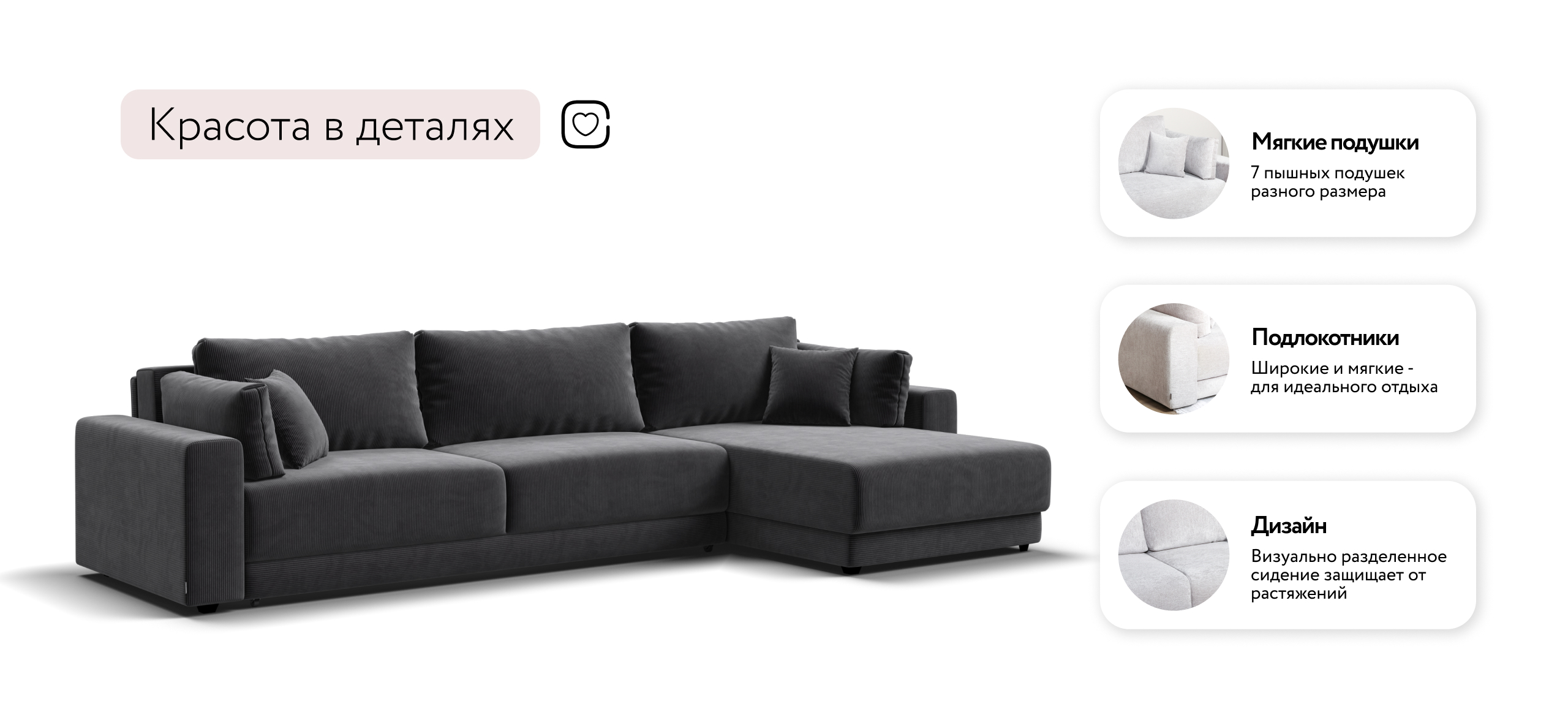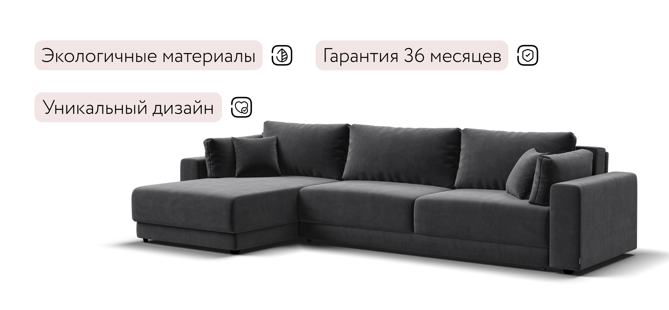 Угловой диван Босс Прайм Макс - это сочетание современного дизайна и продуманной эргономики, создающее уютную атмосферу в любом интерьере. Визуально разделённое сиденье, широкие мягкие подлокотники и пышные подушки разного размера обеспечивают не только эстетическую привлекательность, но и максимальный комфорт.​