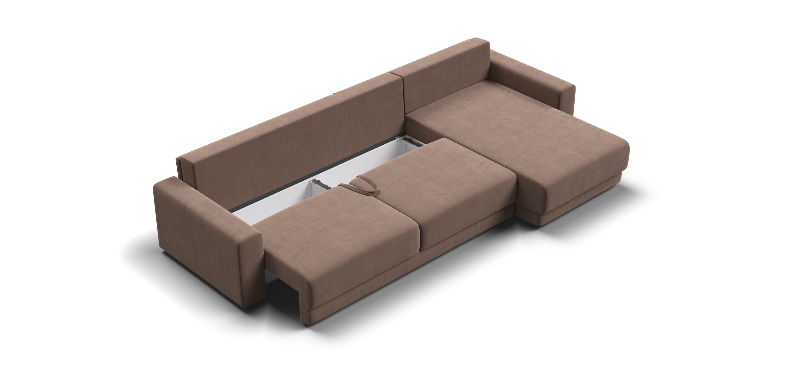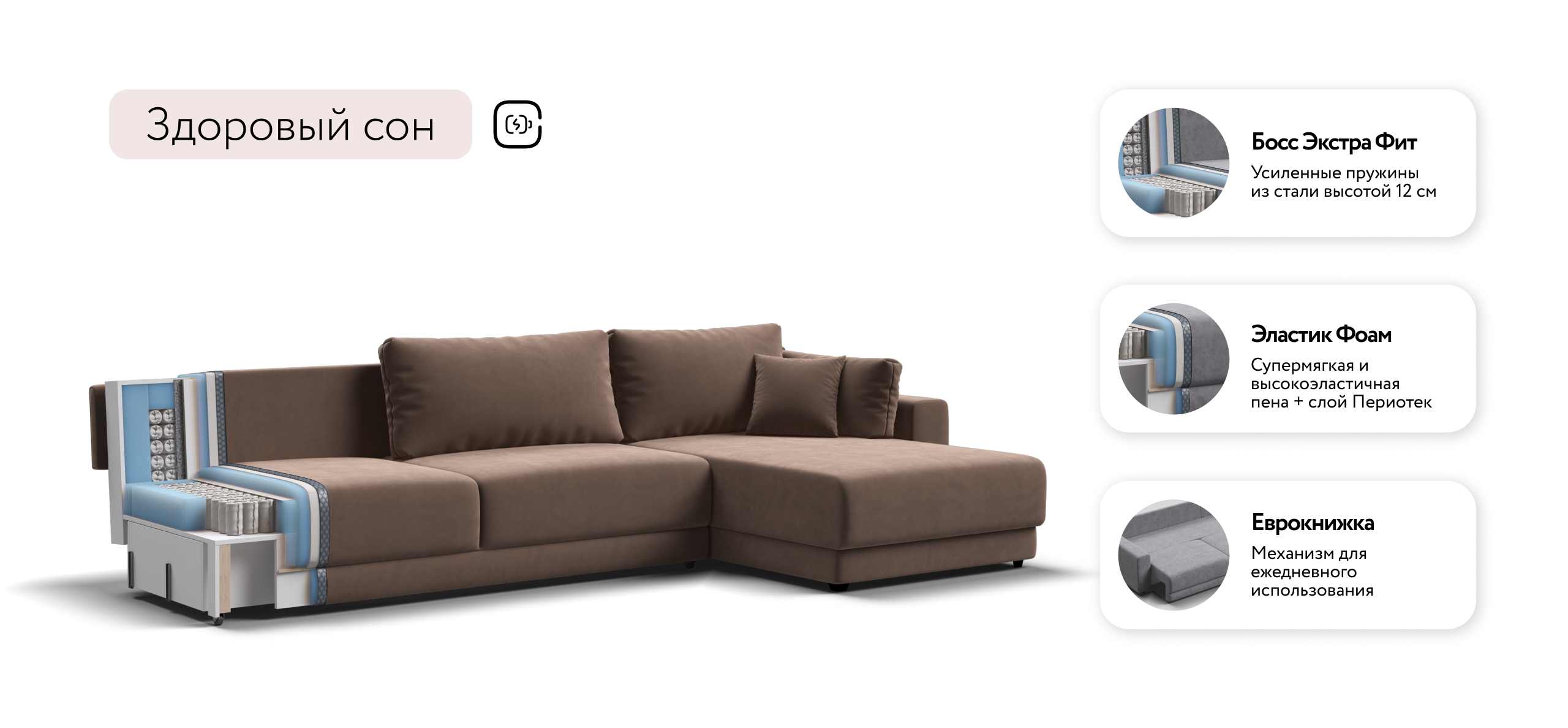 Оснащённый независимым пружинным блоком и высокоэластичной пеной Эластик Фоам с дополнительным слоем периотека, диван гарантирует анатомическую поддержку и комфортный сон. Простой и надёжный механизм трансформации «еврокнижка» позволяет легко преобразовать диван в просторное спальное место. Универсальный угол позволит Вам переставить оттоманку и поменять положение угла при необходимости.