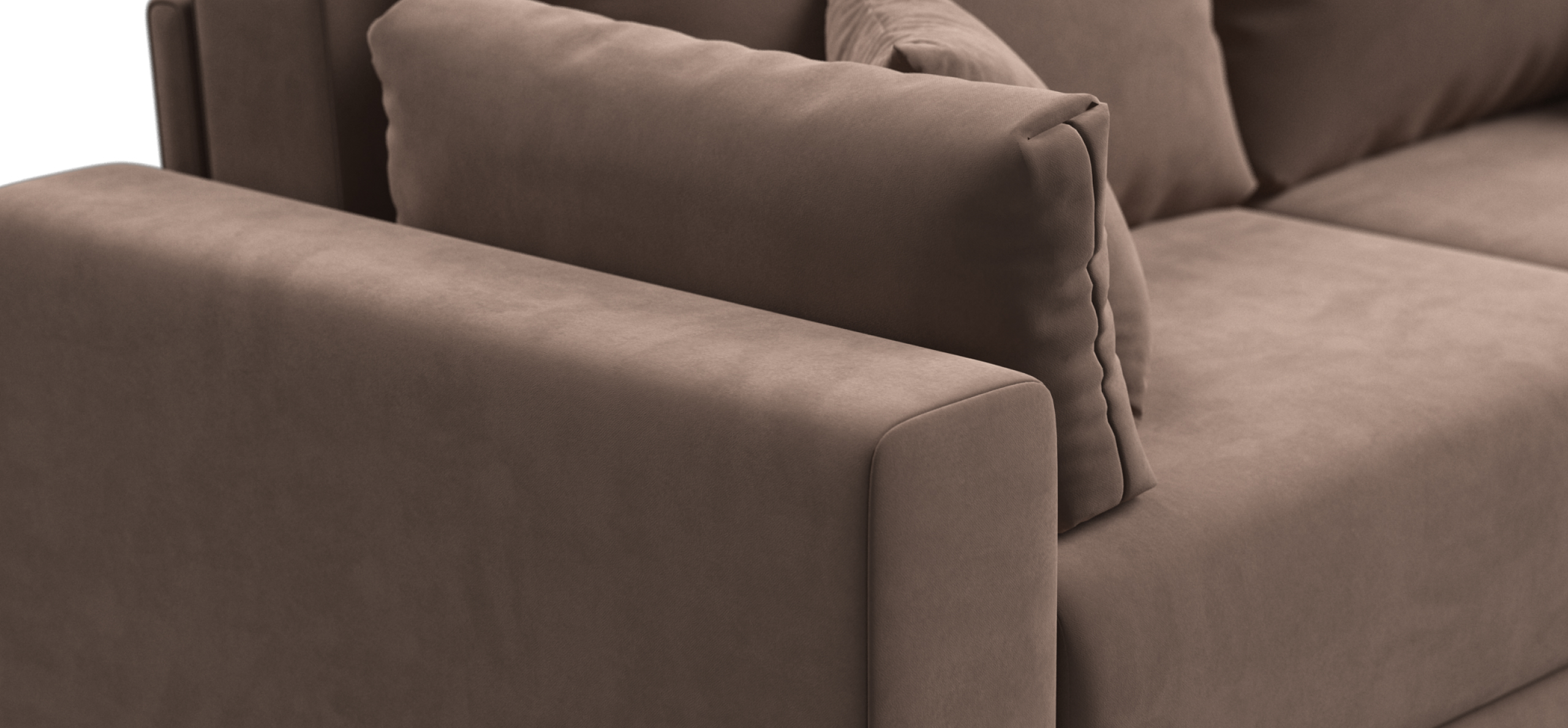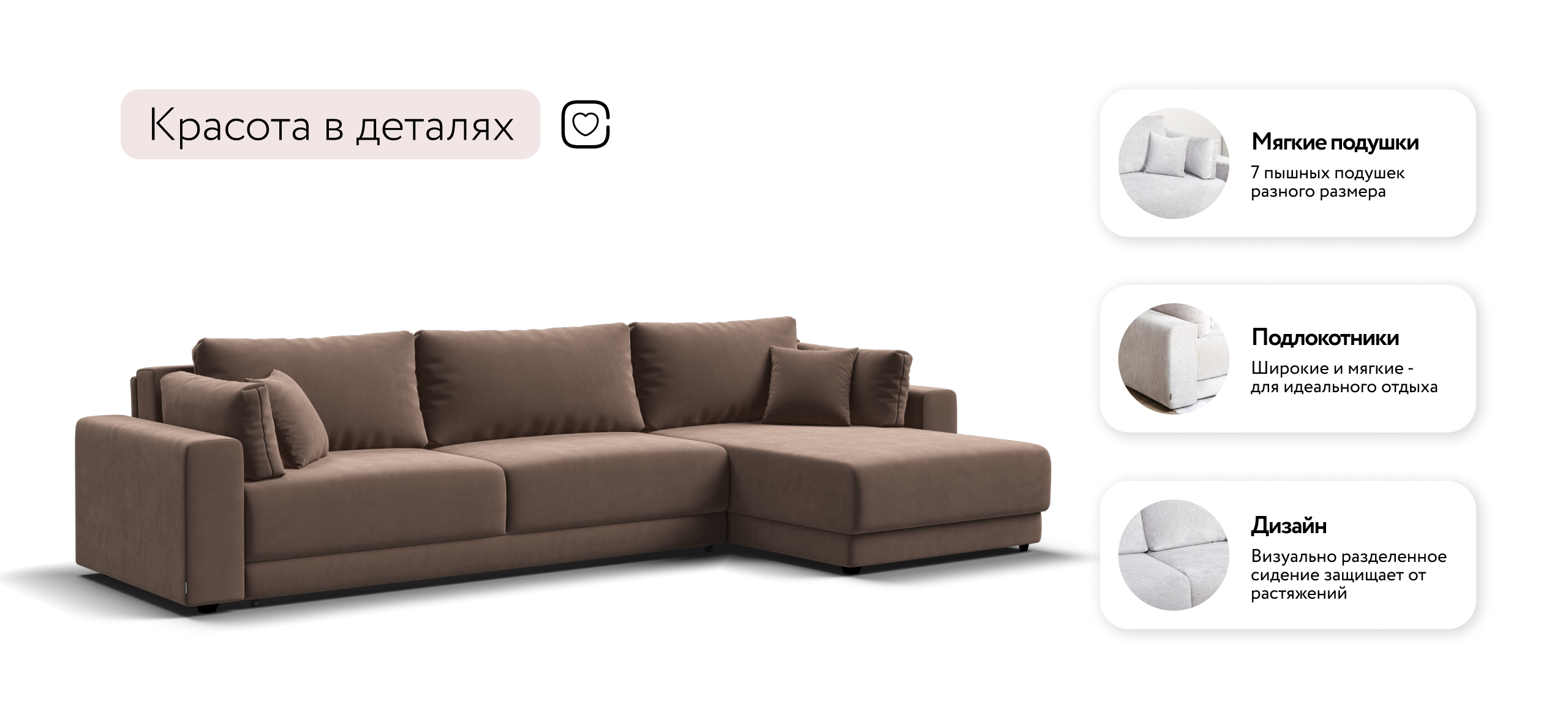 Угловой диван Босс Прайм Макс - это сочетание современного дизайна и продуманной эргономики, создающее уютную атмосферу в любом интерьере. Визуально разделённое сиденье, широкие мягкие подлокотники и пышные подушки разного размера обеспечивают не только эстетическую привлекательность, но и максимальный комфорт.