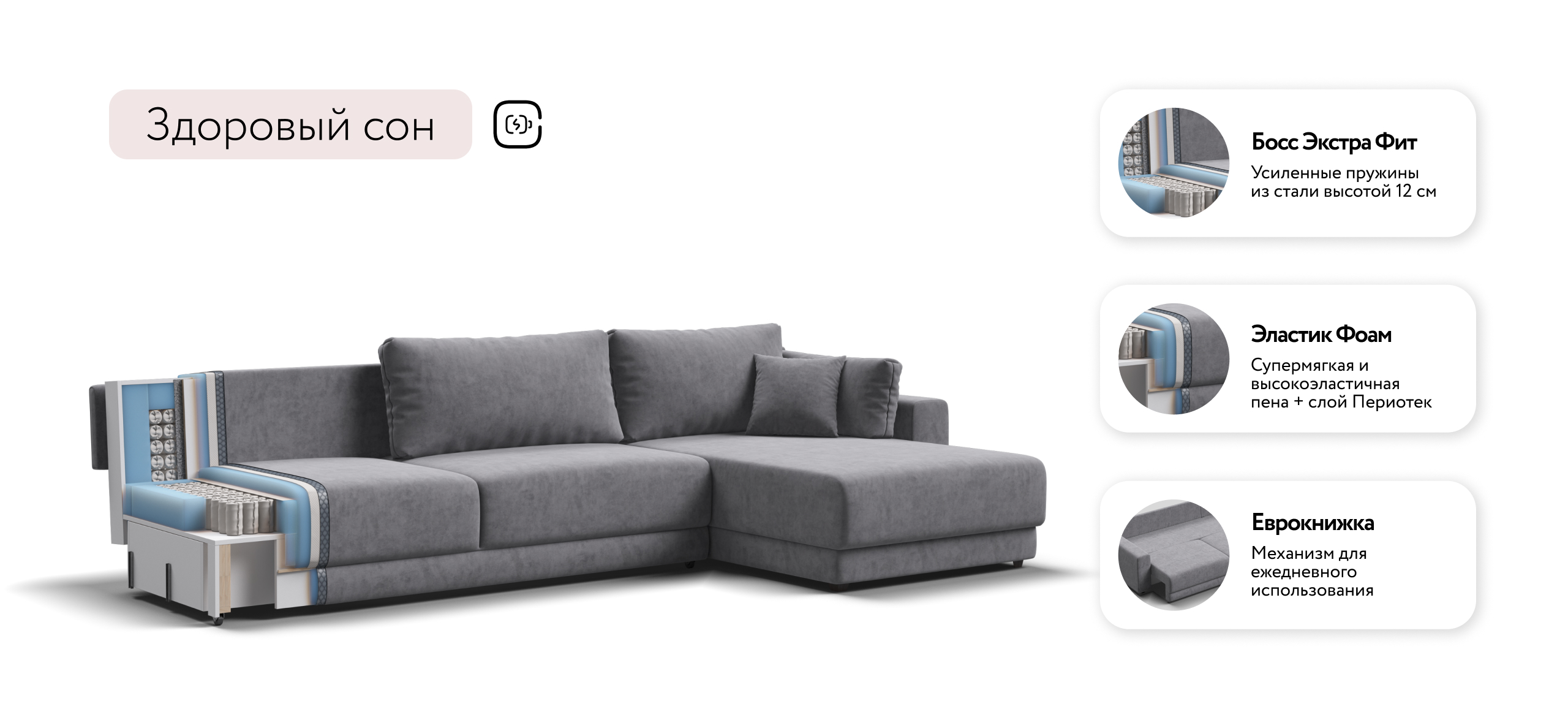 Оснащённый независимым пружинным блоком и высокоэластичной пеной Эластик Фоам с дополнительным слоем периотека, диван гарантирует анатомическую поддержку и комфортный сон. Простой и надёжный механизм трансформации «еврокнижка» позволяет легко преобразовать диван в просторное спальное место. Универсальный угол позволит Вам переставить оттоманку и поменять положение угла при необходимости.