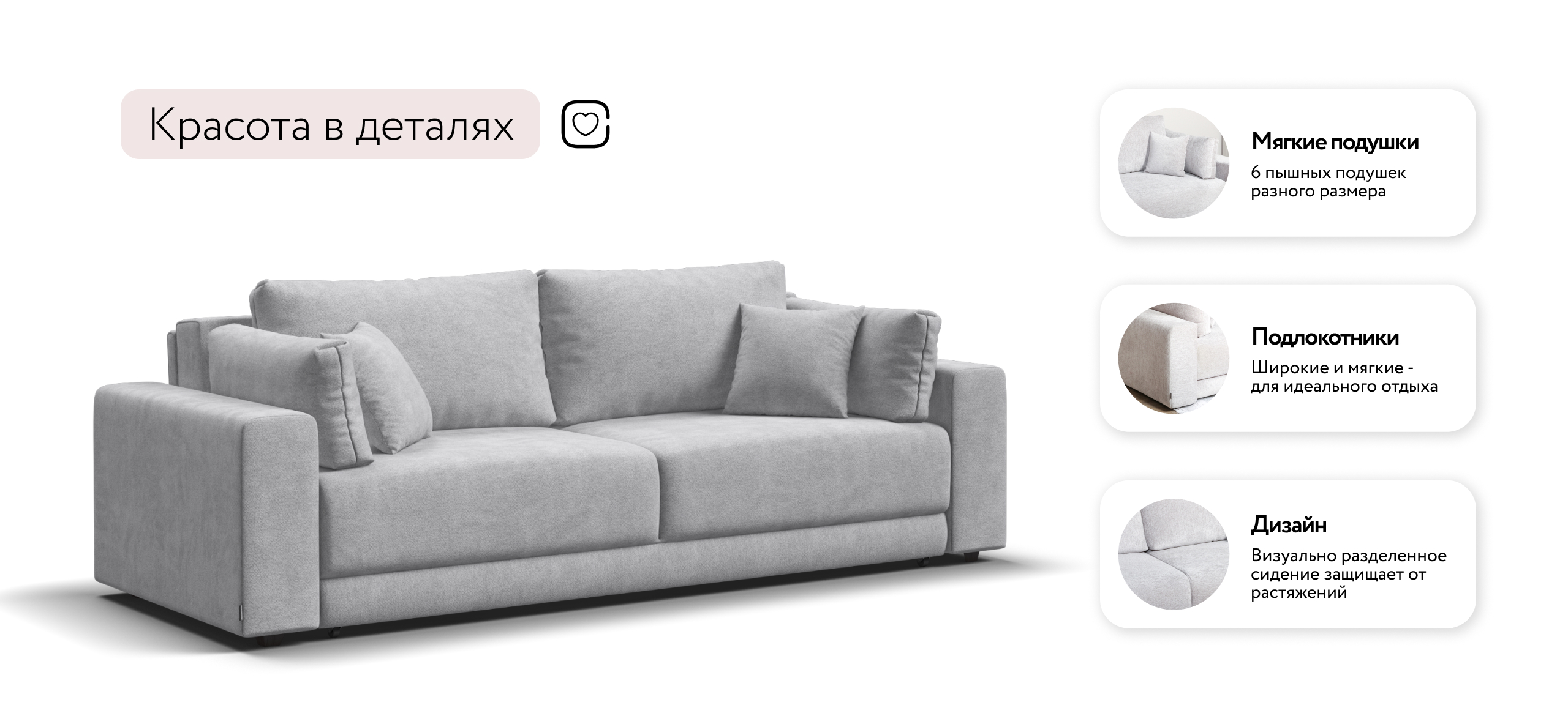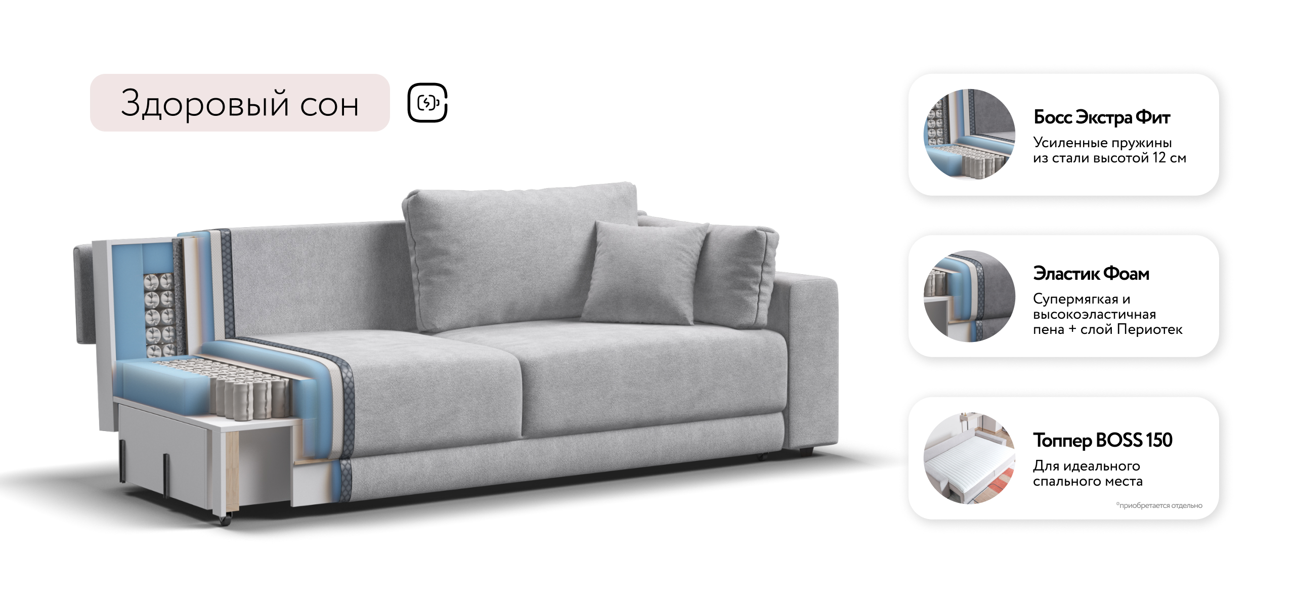 Босс Прайм — это сочетание современного дизайна и продуманной эргономики, создающее уютную атмосферу в любом интерьере. Визуально разделённое сиденье, широкие мягкие подлокотники и пышные подушки разного размера обеспечивают не только эстетическую привлекательность, но и максимальный комфорт.