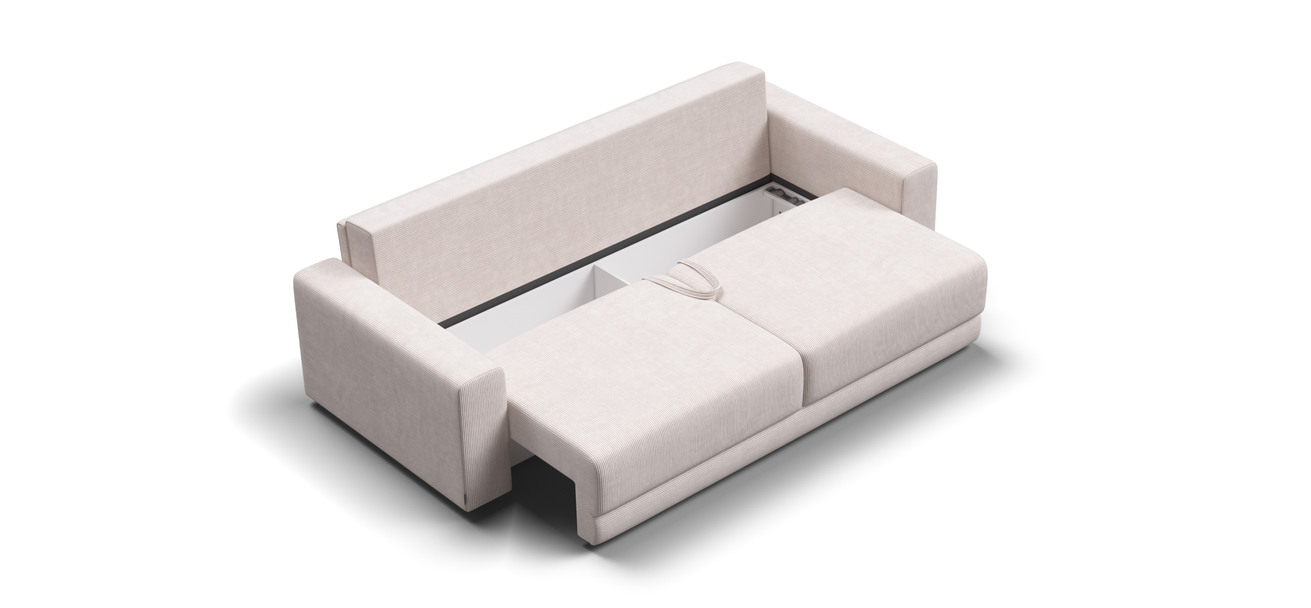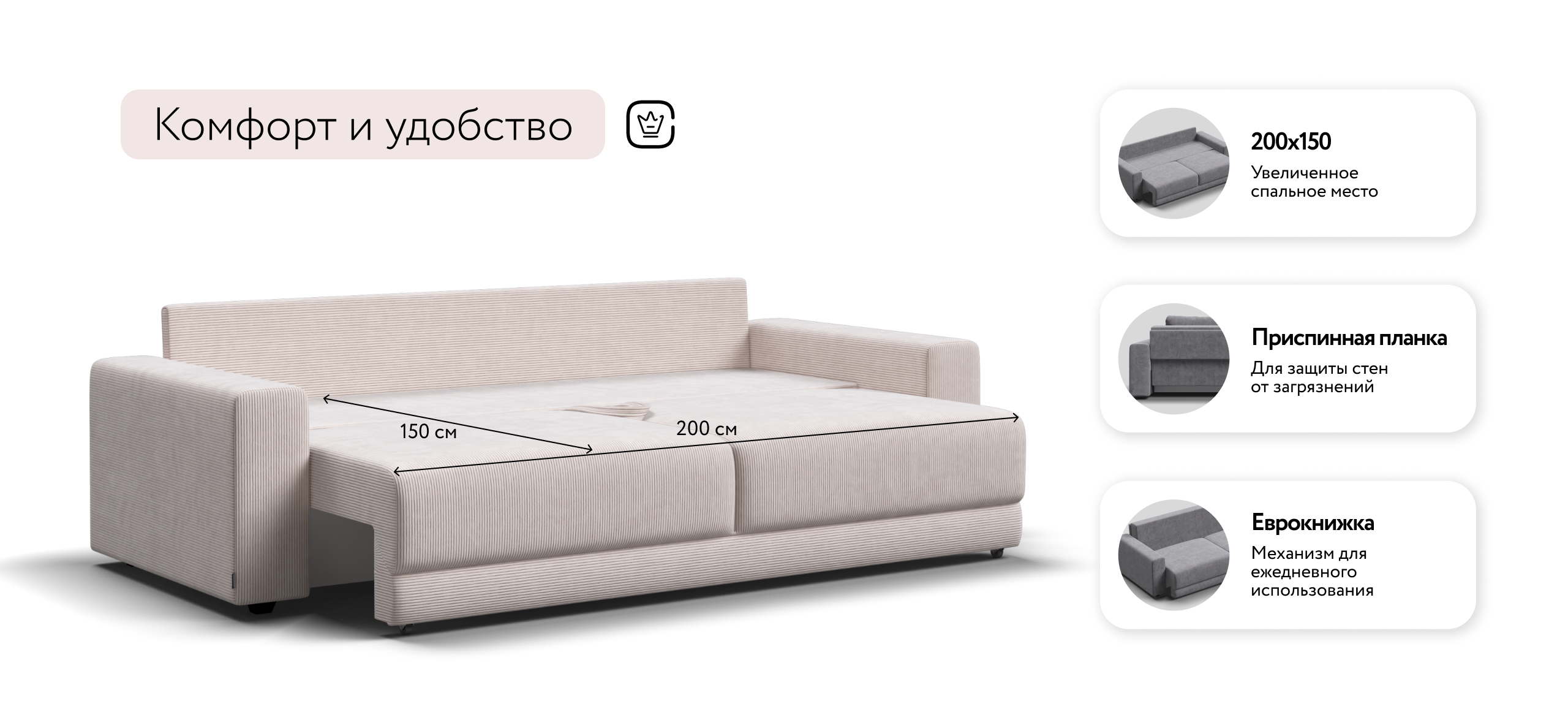 Оснащённый независимым пружинным блоком и высокоэластичной пеной Эластик Фоам с дополнительным слоем периотека, диван гарантирует анатомическую поддержку и комфортный сон. Простой и надёжный механизм трансформации «еврокнижка» позволяет легко преобразовать диван в просторное спальное место.