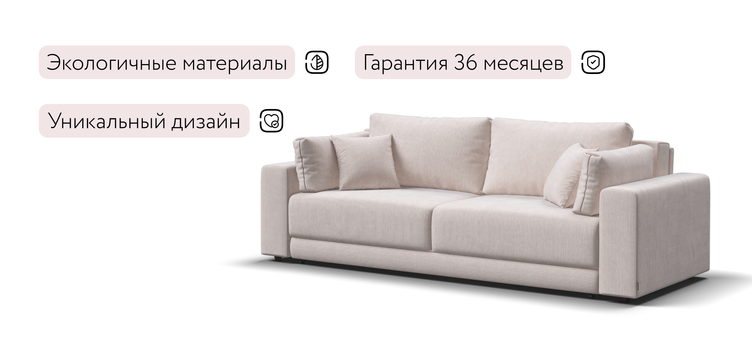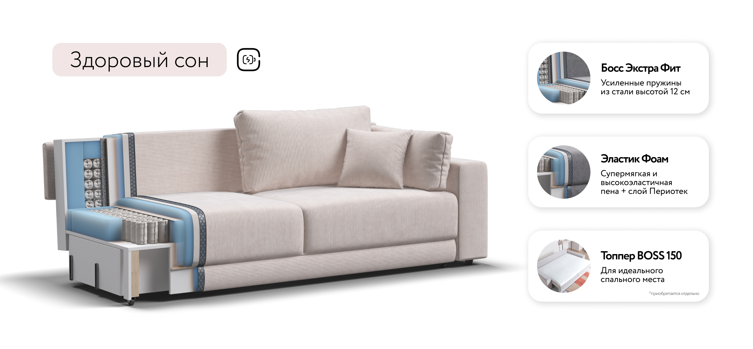 Босс Прайм — это сочетание современного дизайна и продуманной эргономики, создающее уютную атмосферу в любом интерьере. Визуально разделённое сиденье, широкие мягкие подлокотники и пышные подушки разного размера обеспечивают не только эстетическую привлекательность, но и максимальный комфорт.​