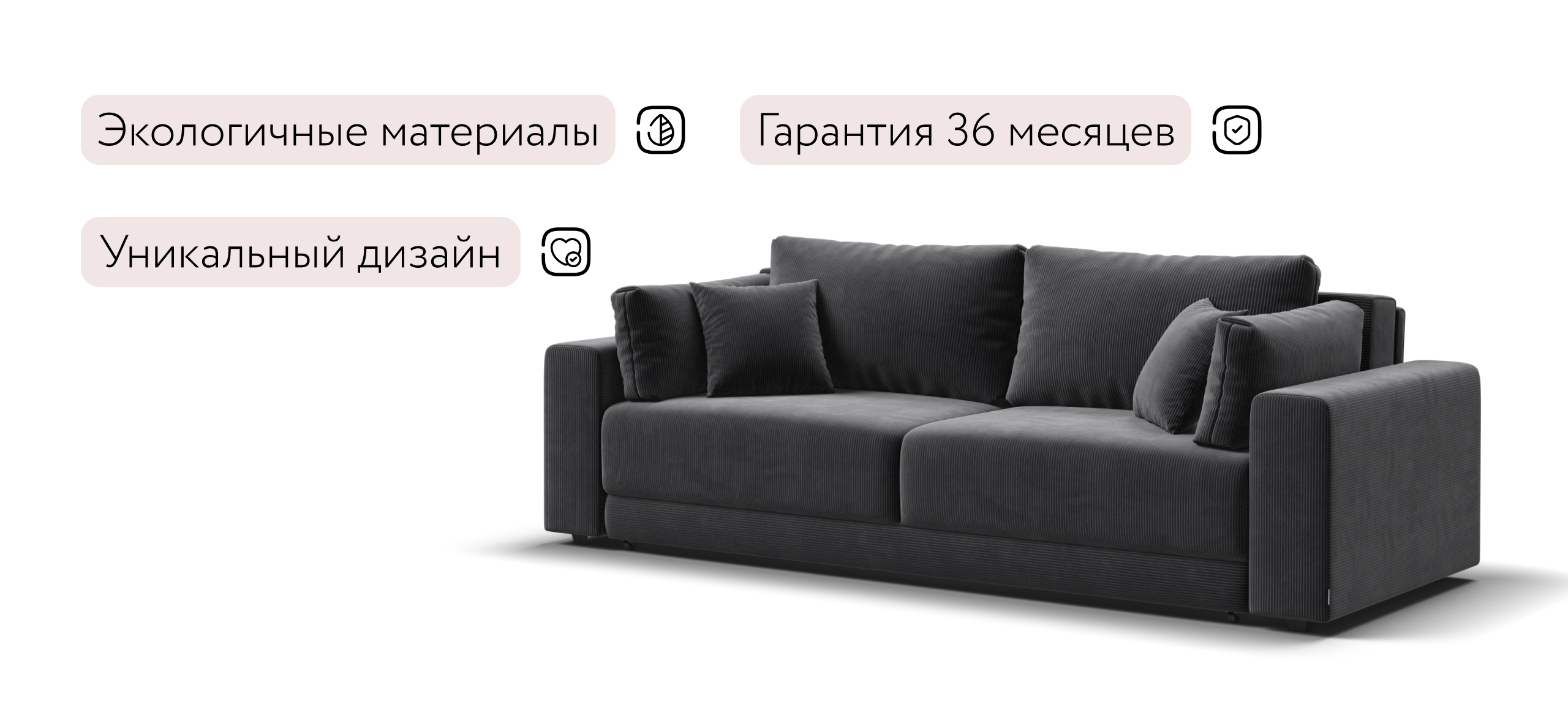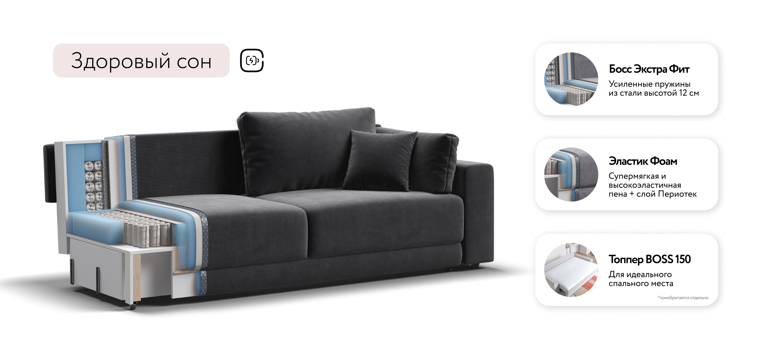 Босс Прайм — это сочетание современного дизайна и продуманной эргономики, создающее уютную атмосферу в любом интерьере. Визуально разделённое сиденье, широкие мягкие подлокотники и пышные подушки разного размера обеспечивают не только эстетическую привлекательность, но и максимальный комфорт.​