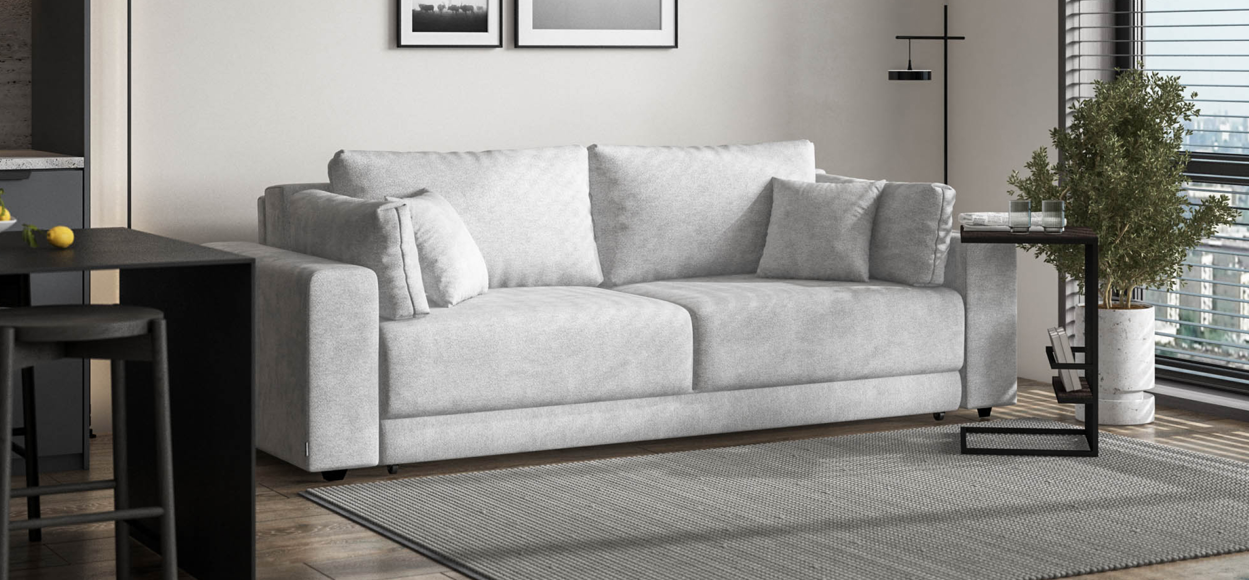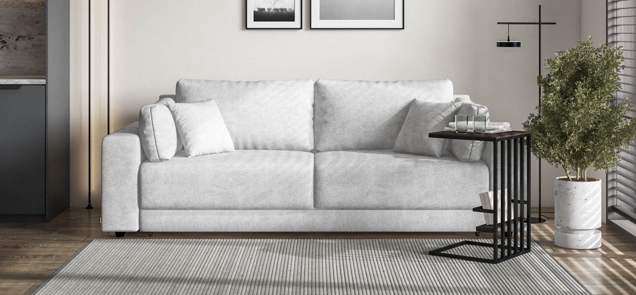Оснащённый независимым пружинным блоком и высокоэластичной пеной Эластик Фоам с дополнительным слоем периотека, диван гарантирует анатомическую поддержку и комфортный сон. Простой и надёжный механизм трансформации «еврокнижка» позволяет легко преобразовать диван в просторное спальное место.