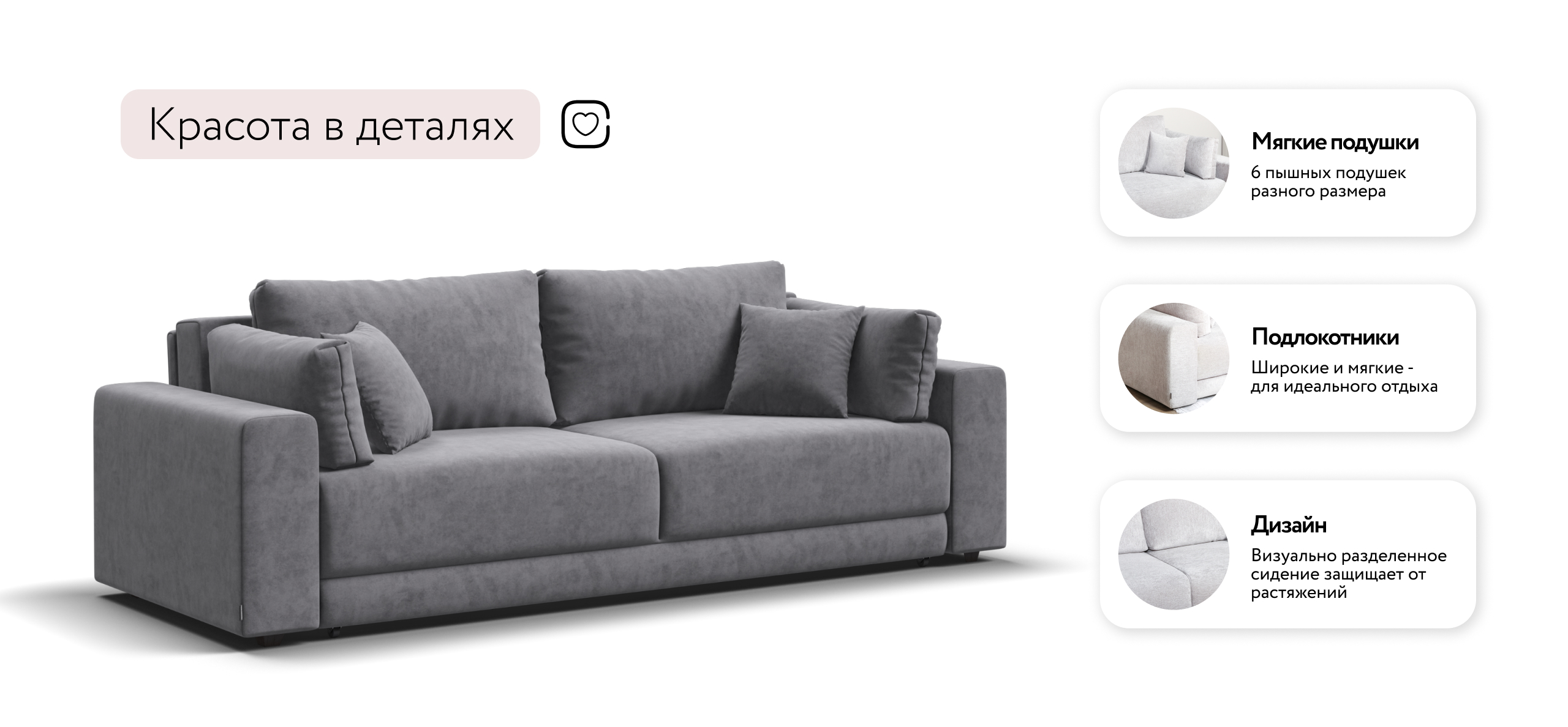 Босс Прайм — это сочетание современного дизайна и продуманной эргономики, создающее уютную атмосферу в любом интерьере. Визуально разделённое сиденье, широкие мягкие подлокотники и пышные подушки разного размера обеспечивают не только эстетическую привлекательность, но и максимальный комфорт.​