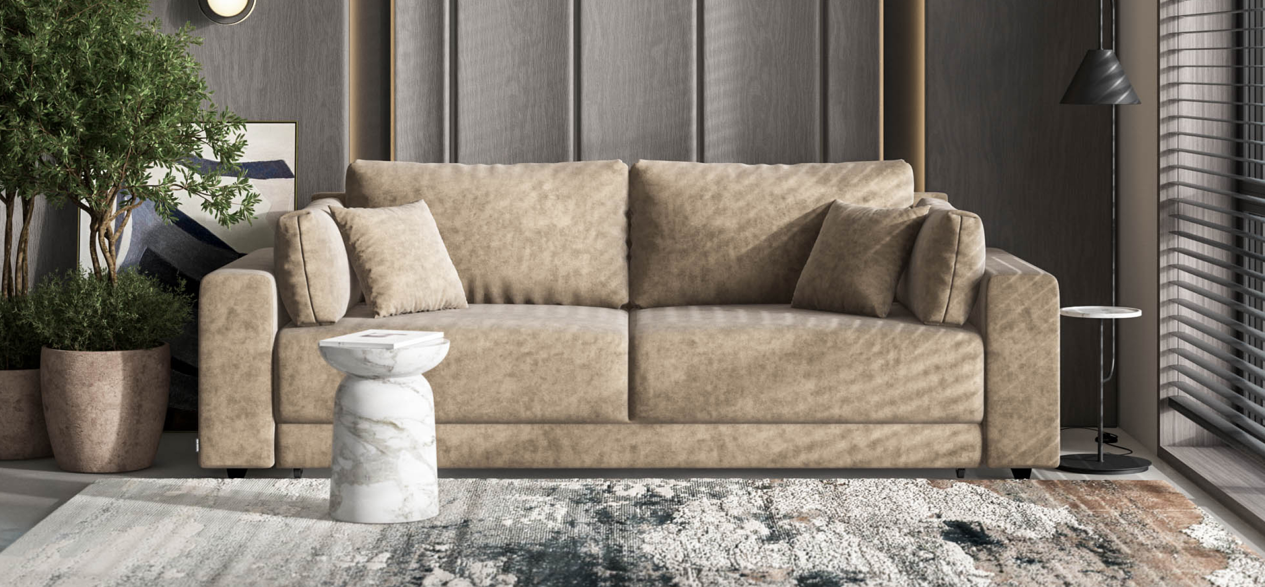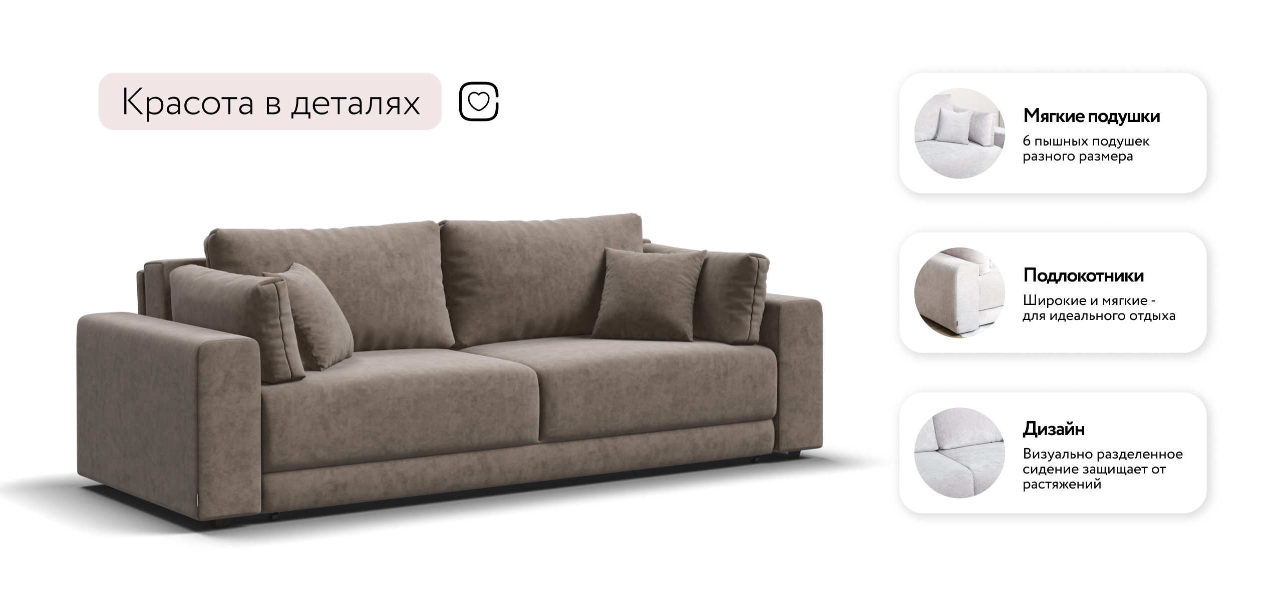 Босс Прайм — это сочетание современного дизайна и продуманной эргономики, создающее уютную атмосферу в любом интерьере. Визуально разделённое сиденье, широкие мягкие подлокотники и пышные подушки разного размера обеспечивают не только эстетическую привлекательность, но и максимальный комфорт.