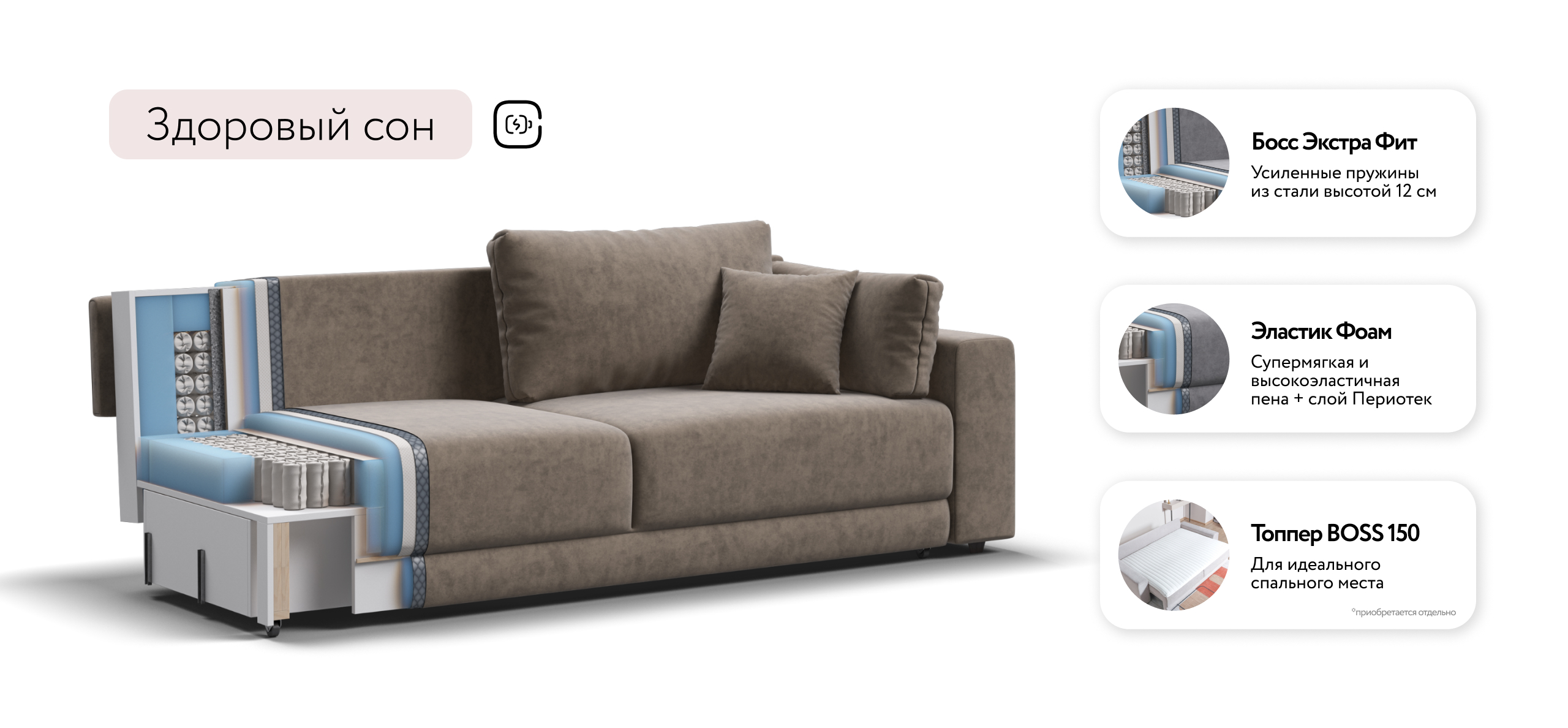 Оснащённый независимым пружинным блоком и высокоэластичной пеной Эластик Фоам с дополнительным слоем периотека, диван гарантирует анатомическую поддержку и комфортный сон. Простой и надёжный механизм трансформации «еврокнижка» позволяет легко преобразовать диван в просторное спальное место.