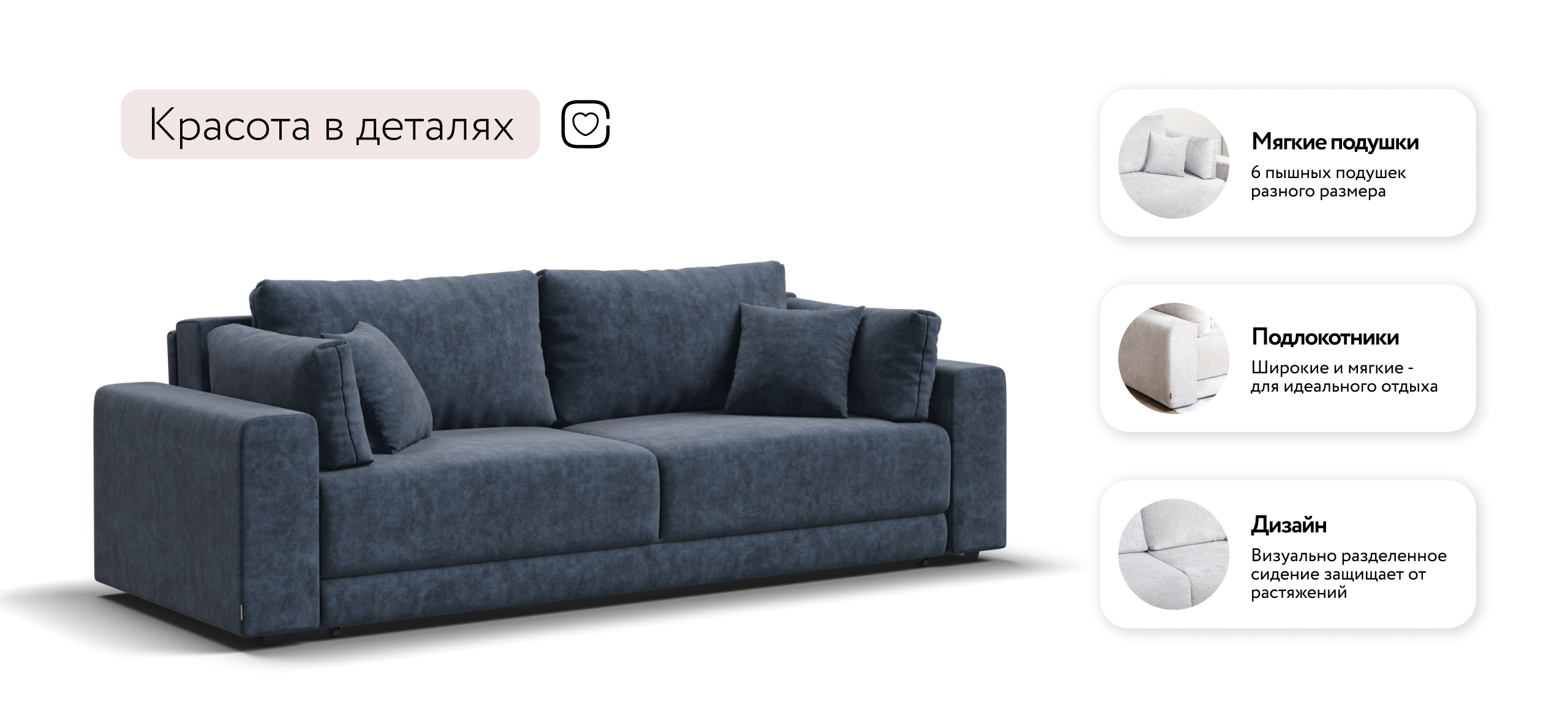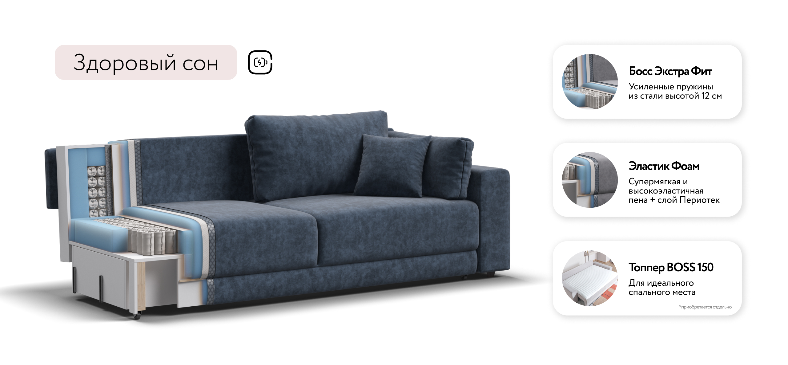 Босс Прайм — это сочетание современного дизайна и продуманной эргономики, создающее уютную атмосферу в любом интерьере. Визуально разделённое сиденье, широкие мягкие подлокотники и пышные подушки разного размера обеспечивают не только эстетическую привлекательность, но и максимальный комфорт.​