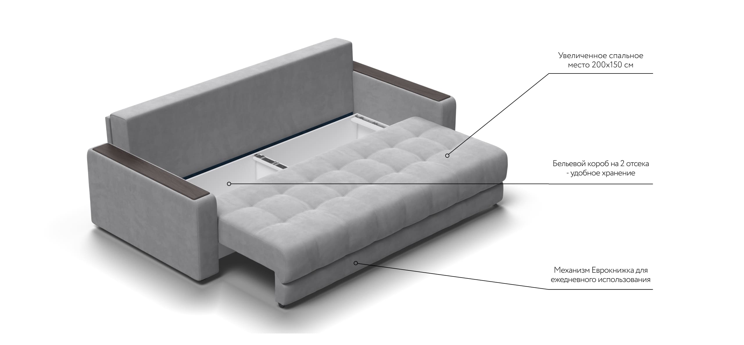 Легкая трансформация в три положения создаст для Вас максимально комфортный отдых, а улучшенное анатомическое основание в диване обеспечит Вам здоровый сон. Спинка защищает от соприкосновения со стеной во время сна.