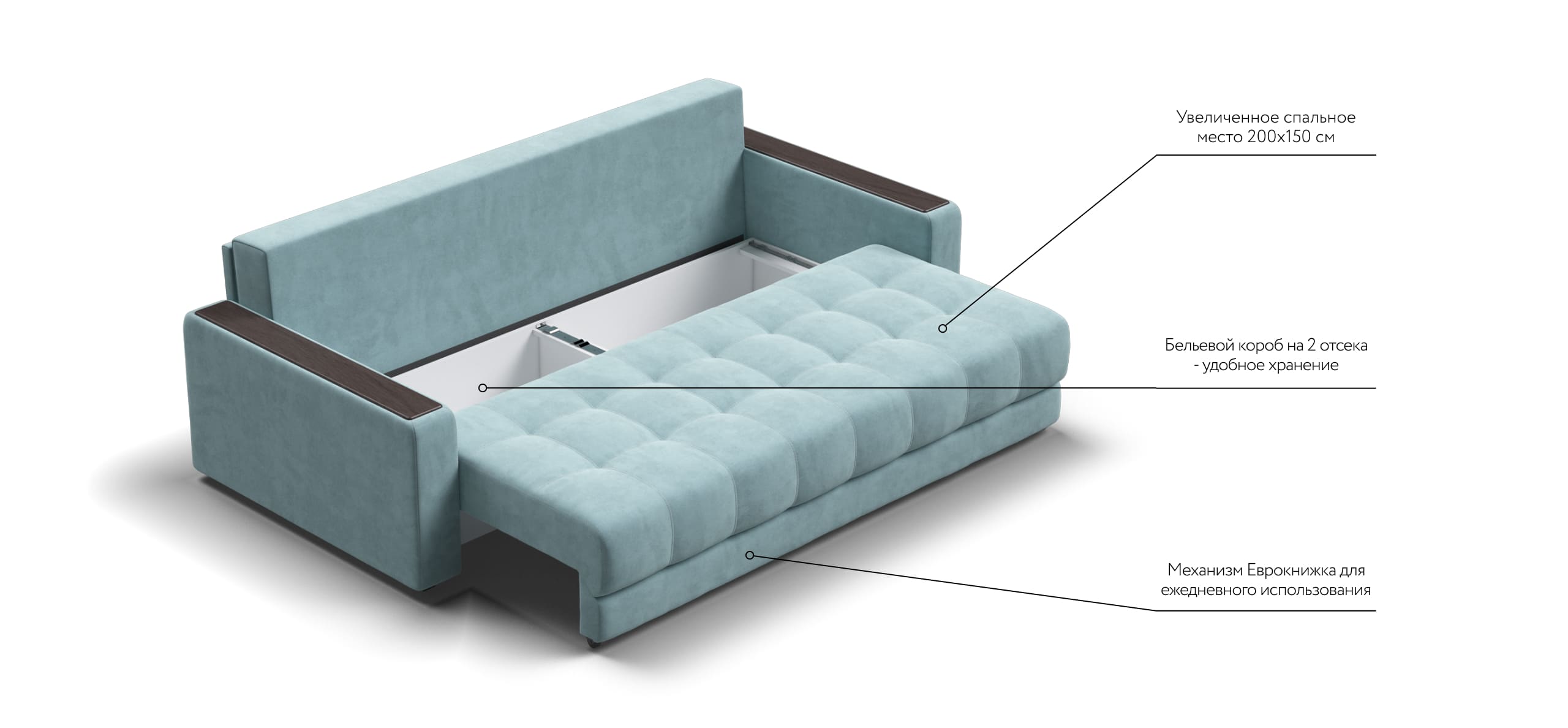 Легкая трансформация в три положения создаст для Вас максимально комфортный отдых, а улучшенное анатомическое основание в диване обеспечит Вам здоровый сон. Спинка защищает от соприкосновения со стеной во время сна.