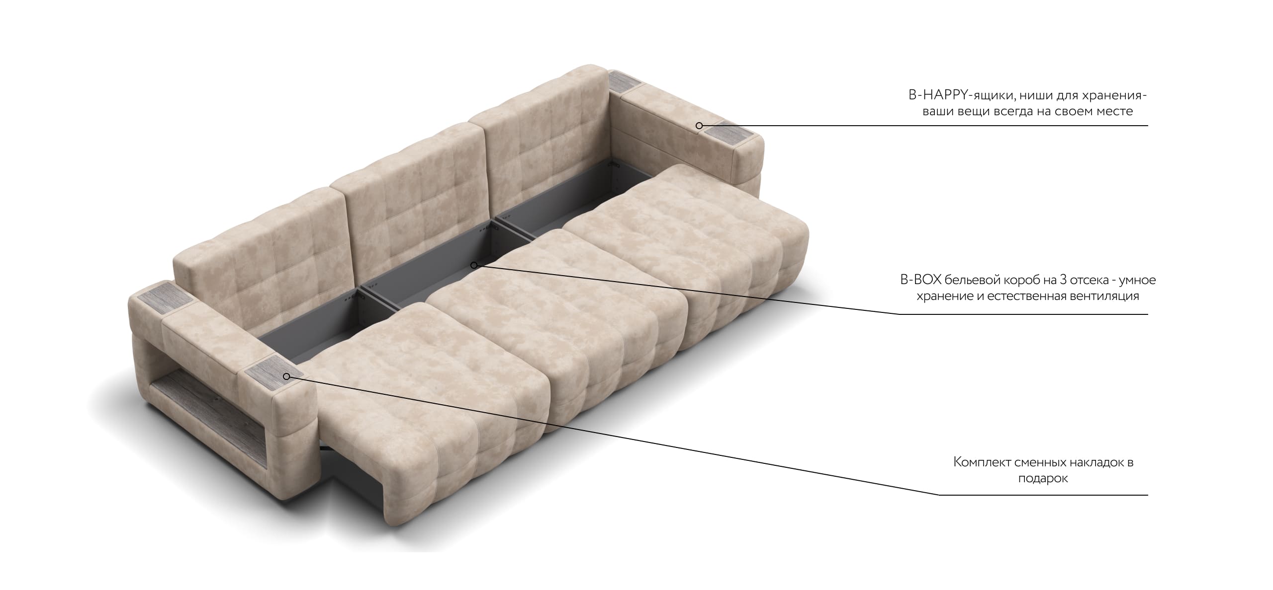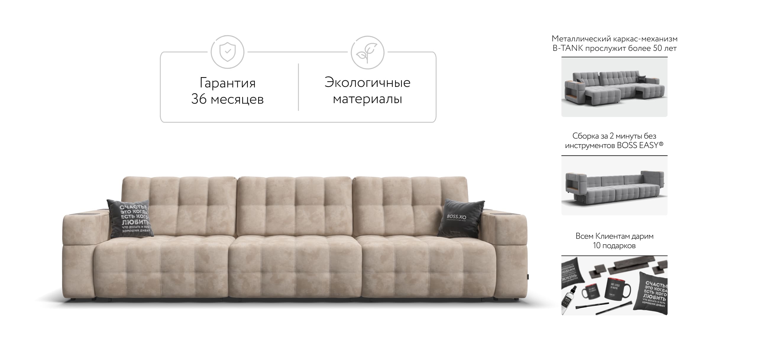 Покупая диван BOSS.XO MAX вы становитесь обладателем уникальных подарков: быстрая зарядка для смартфона, 2 стильных кружки, 2 удобных столика для ноутбука, 2 подушки, комплект запасных накладок на подлокотники B-HAPPY®️, экоручки и средство для чистки BOSS Clean.
