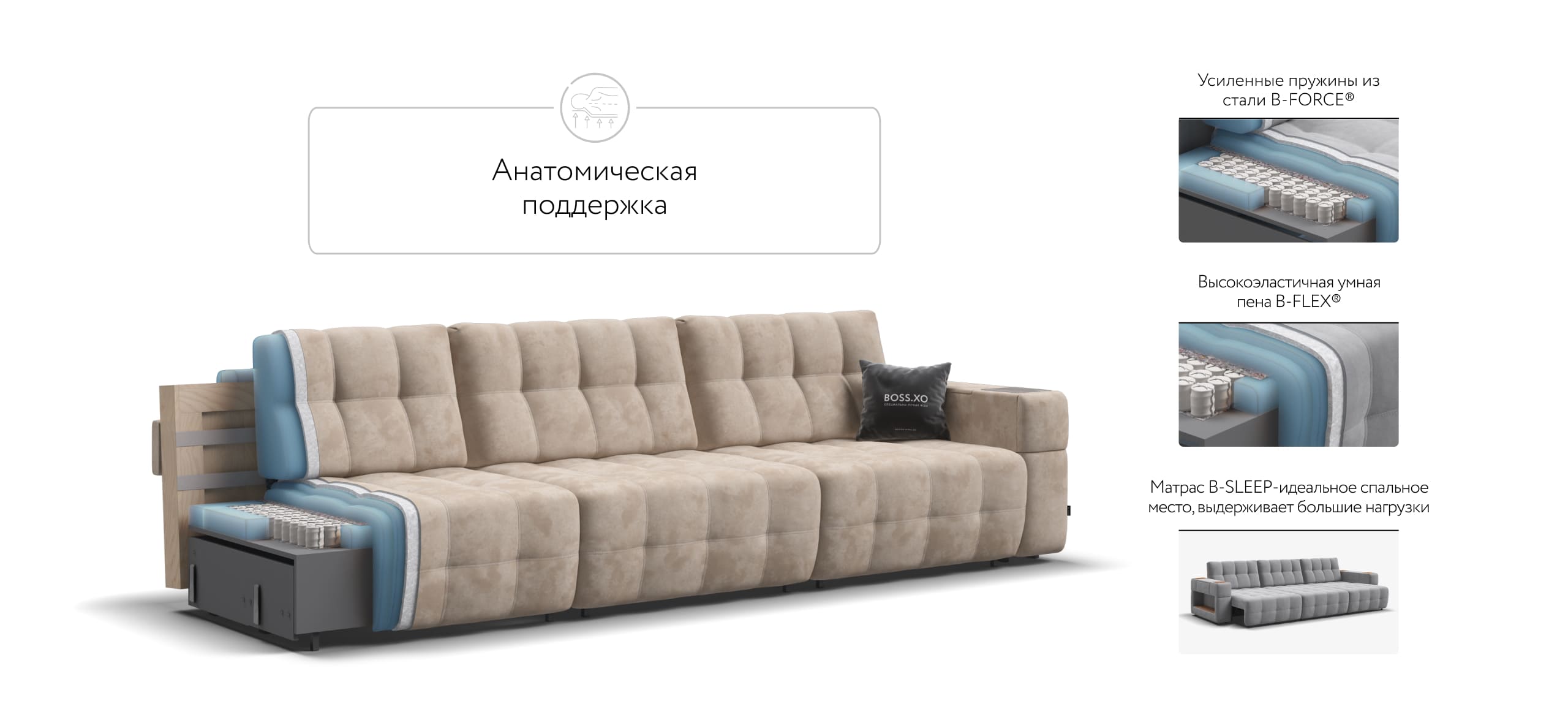 BOSS.XO MAX по своим характеристикам лучше многих диванов с ценой от 300 тысяч рублей.