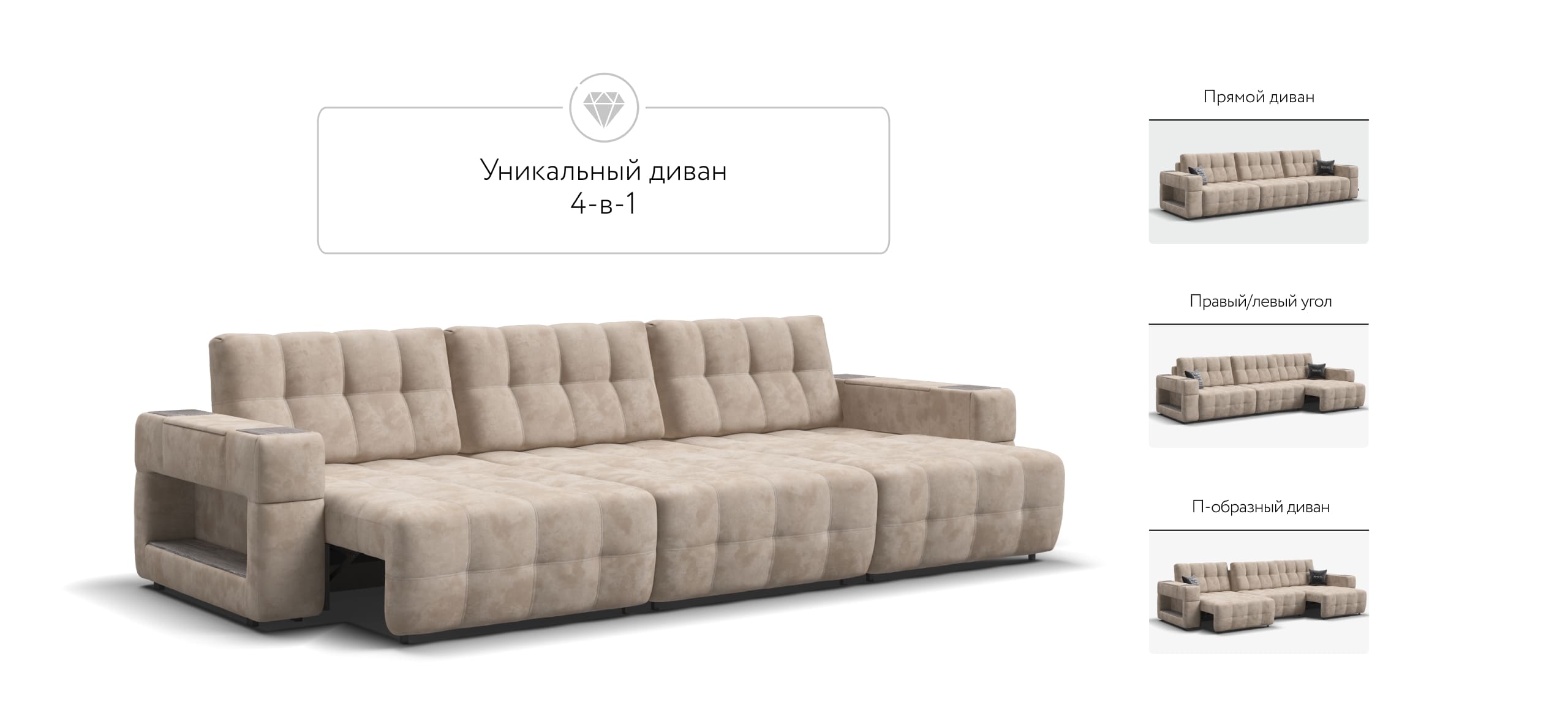 BOSS.XO MAX - это и прямой, угловой и П-образный диван сразу, за 10 секунд вы можете превратить его в правый или левый угол, а также в П-образный.