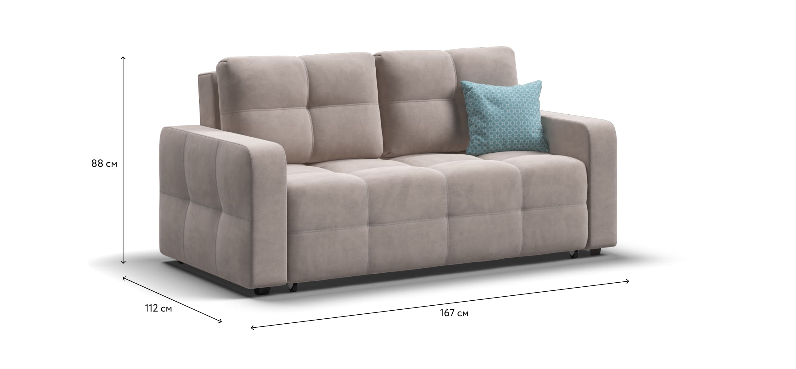 Небольшой размер дивана сочетается с оптимальным спальным местом, на котором могут с комфортом разместиться 2 человека.