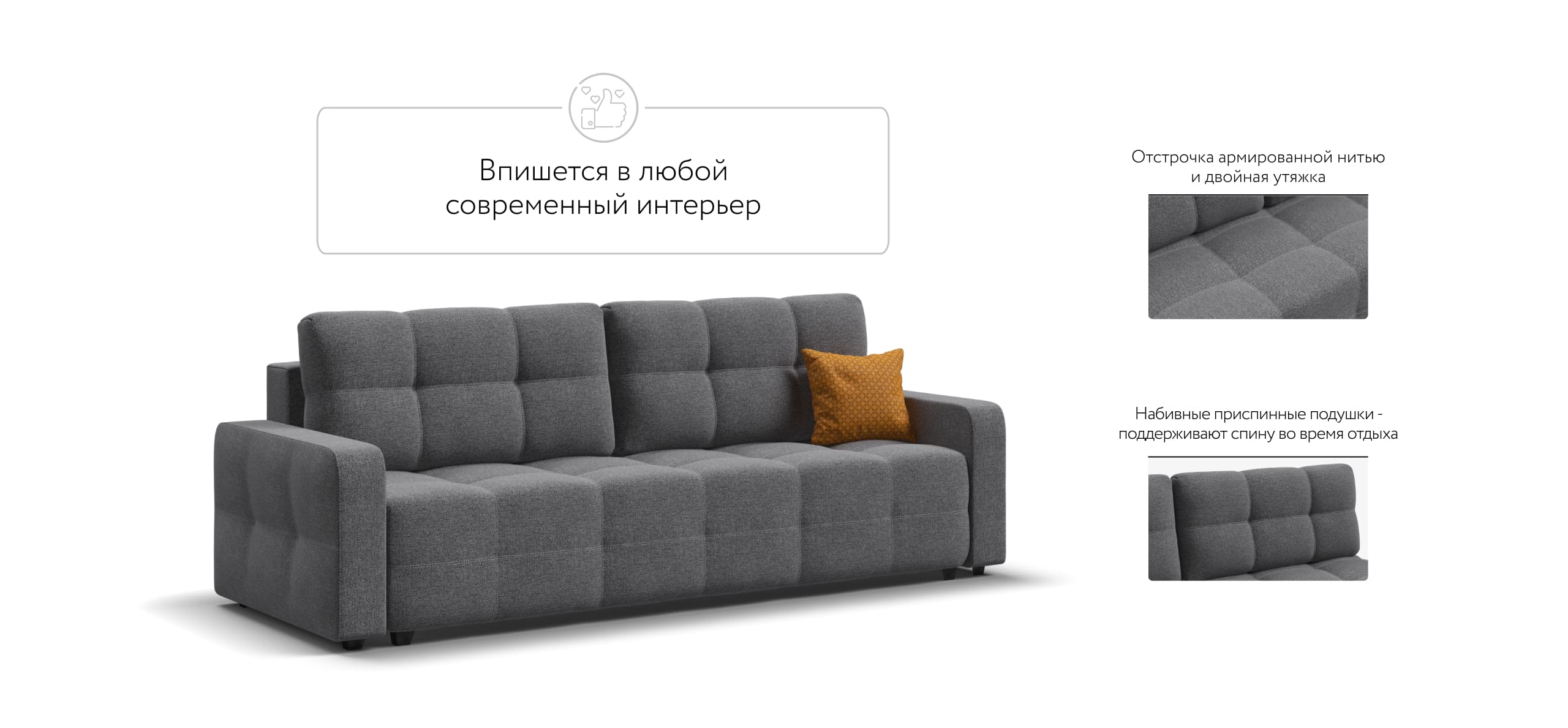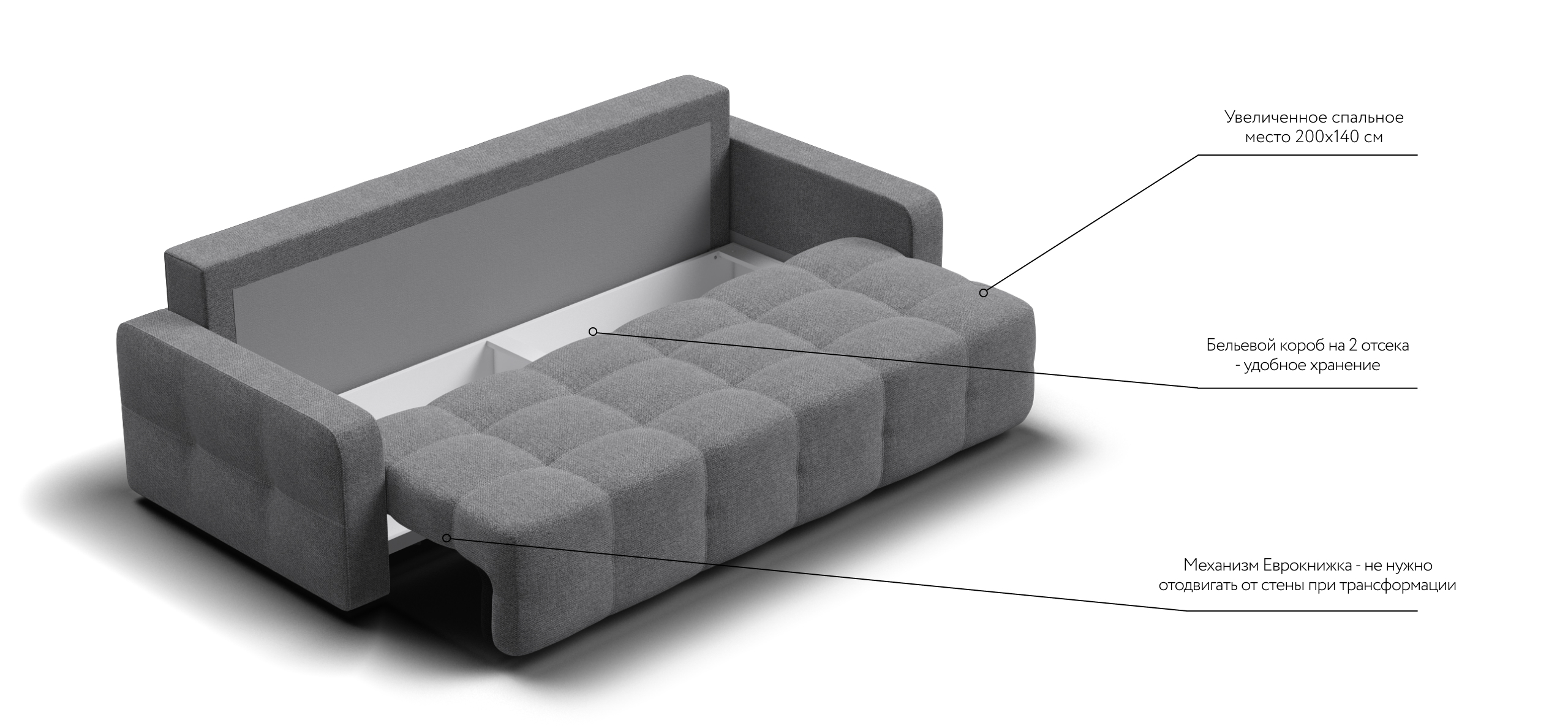 Простой и надежный механизм трансформации еврокнижка позволяет с легкостью раскладывать диван в удобную, полноценную, двуспальную кровать с идеально ровным спальным местом.