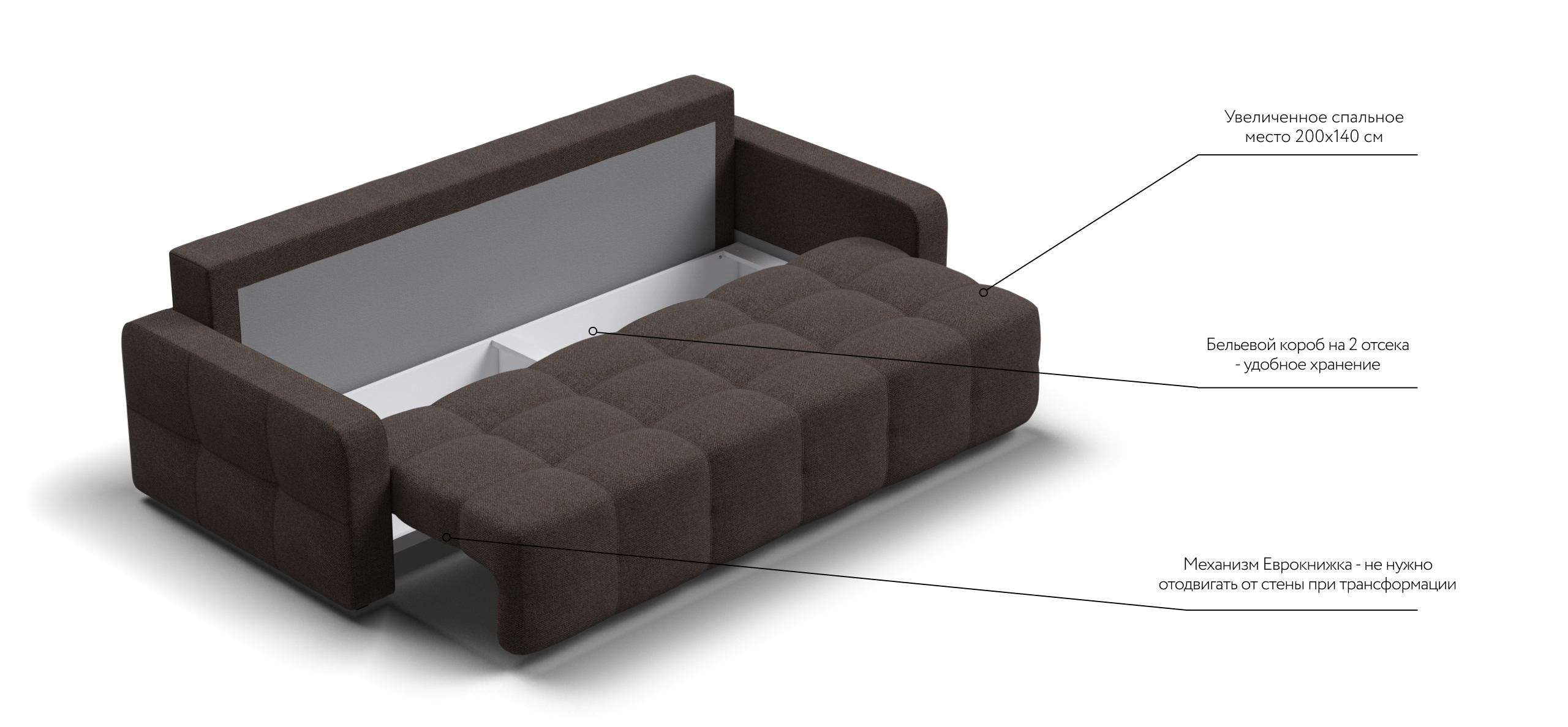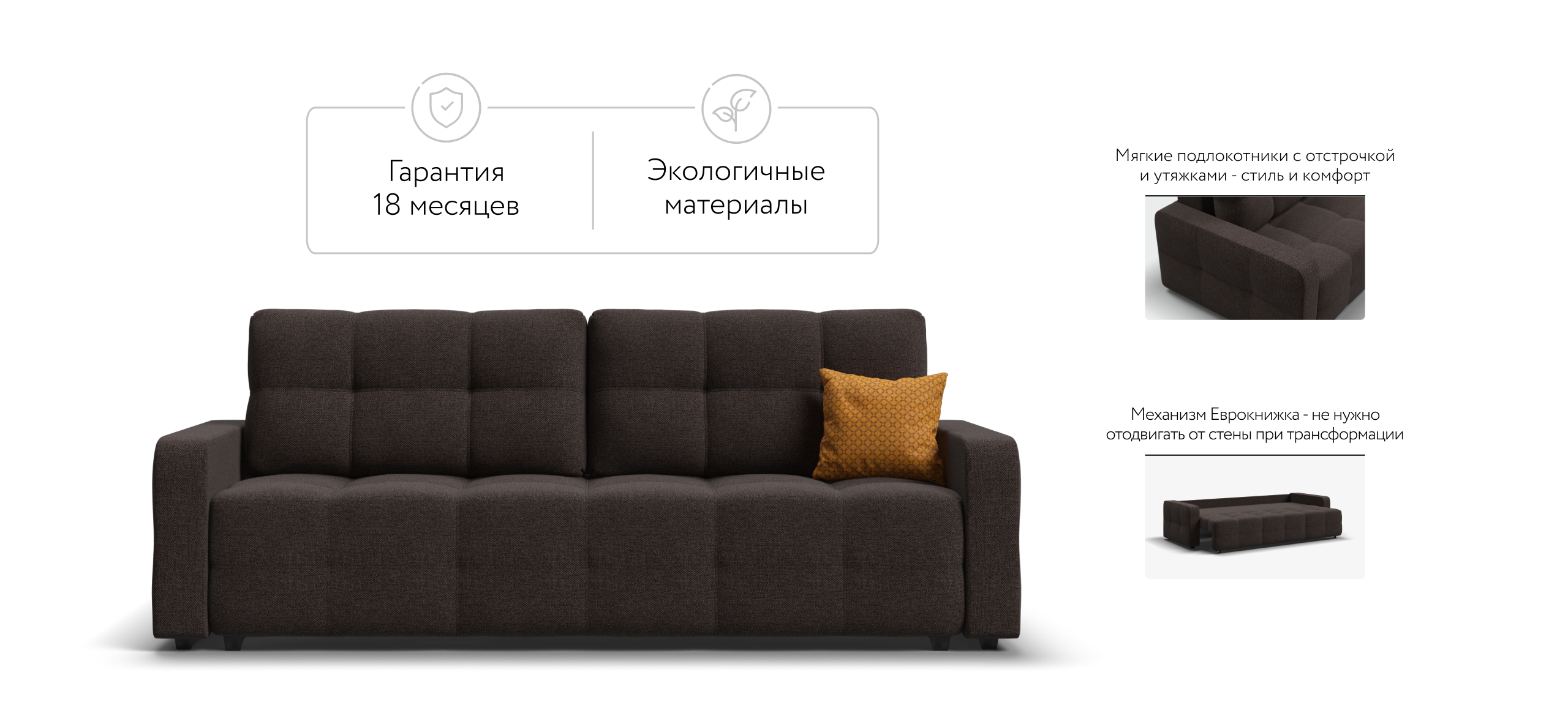 Простой и надежный механизм трансформации еврокнижка позволяет с легкостью раскладывать диван в удобную, полноценную, двуспальную кровать с идеально ровным спальным местом.