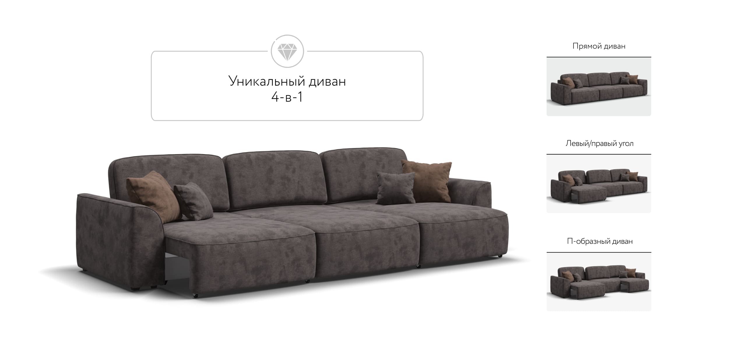 Приглашайте в гости большую компанию - диван вместит всех! Каждое посадочное место можно выдвинуть вперед и получить диван с правым или левым углом, а также получить П-образную форму дивана. А в разложенном виде диван превращается в огромное спальное место.