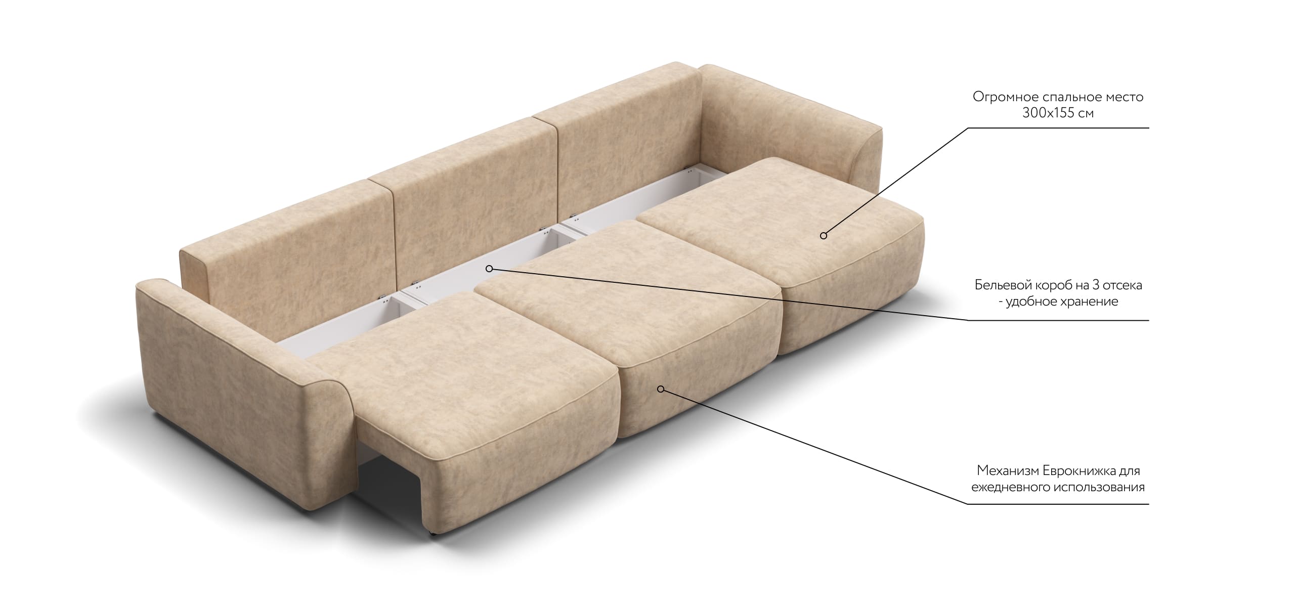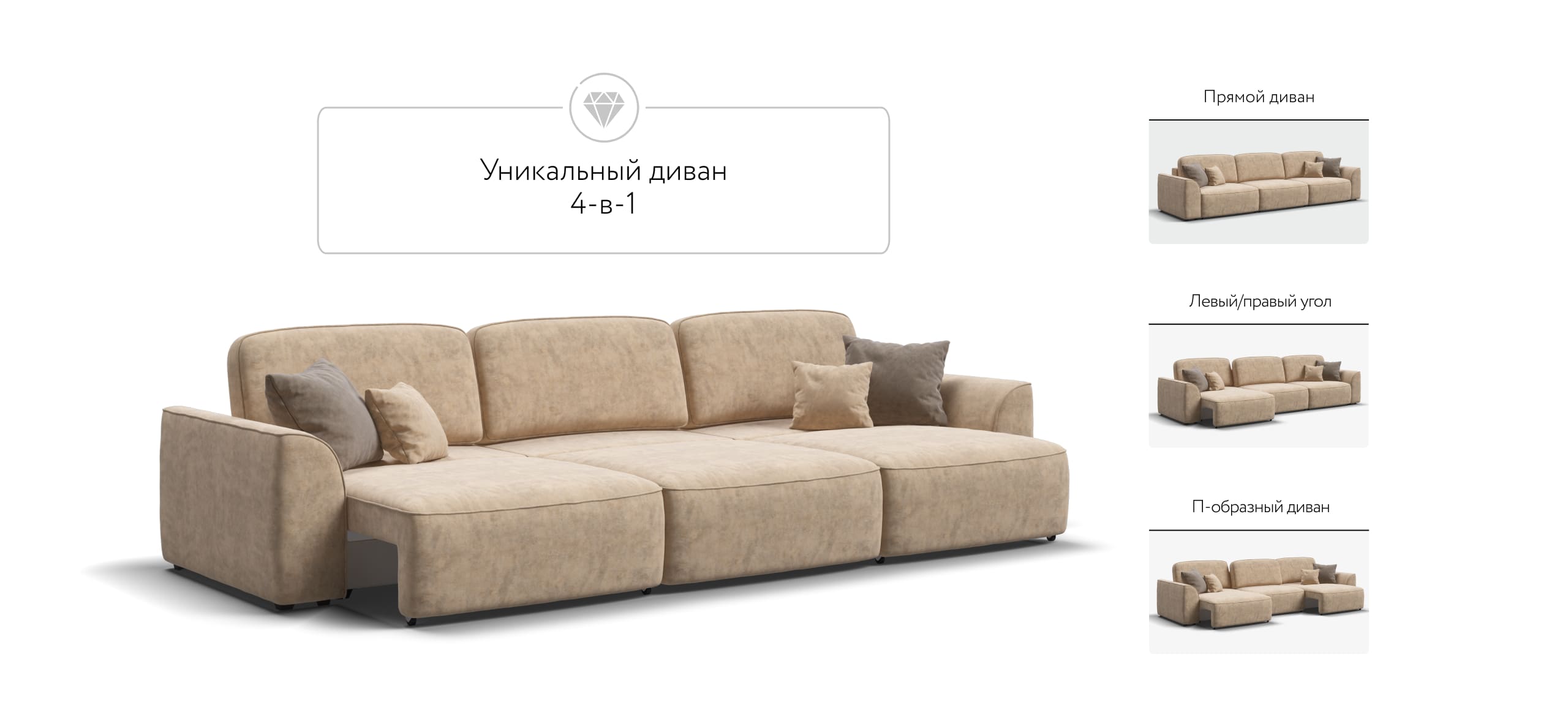 Приглашайте в гости большую компанию - диван вместит всех! Каждое посадочное место можно выдвинуть вперед и получить диван с правым или левым углом, а также получить П-образную форму дивана. А в разложенном виде диван превращается в огромное спальное место.