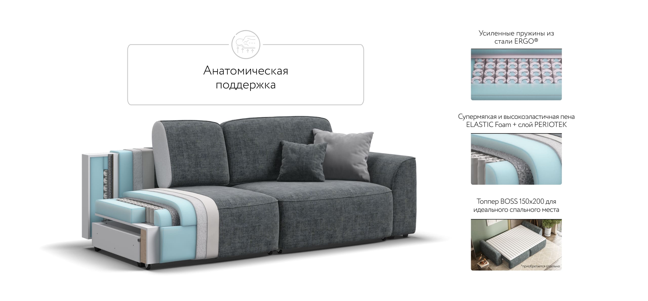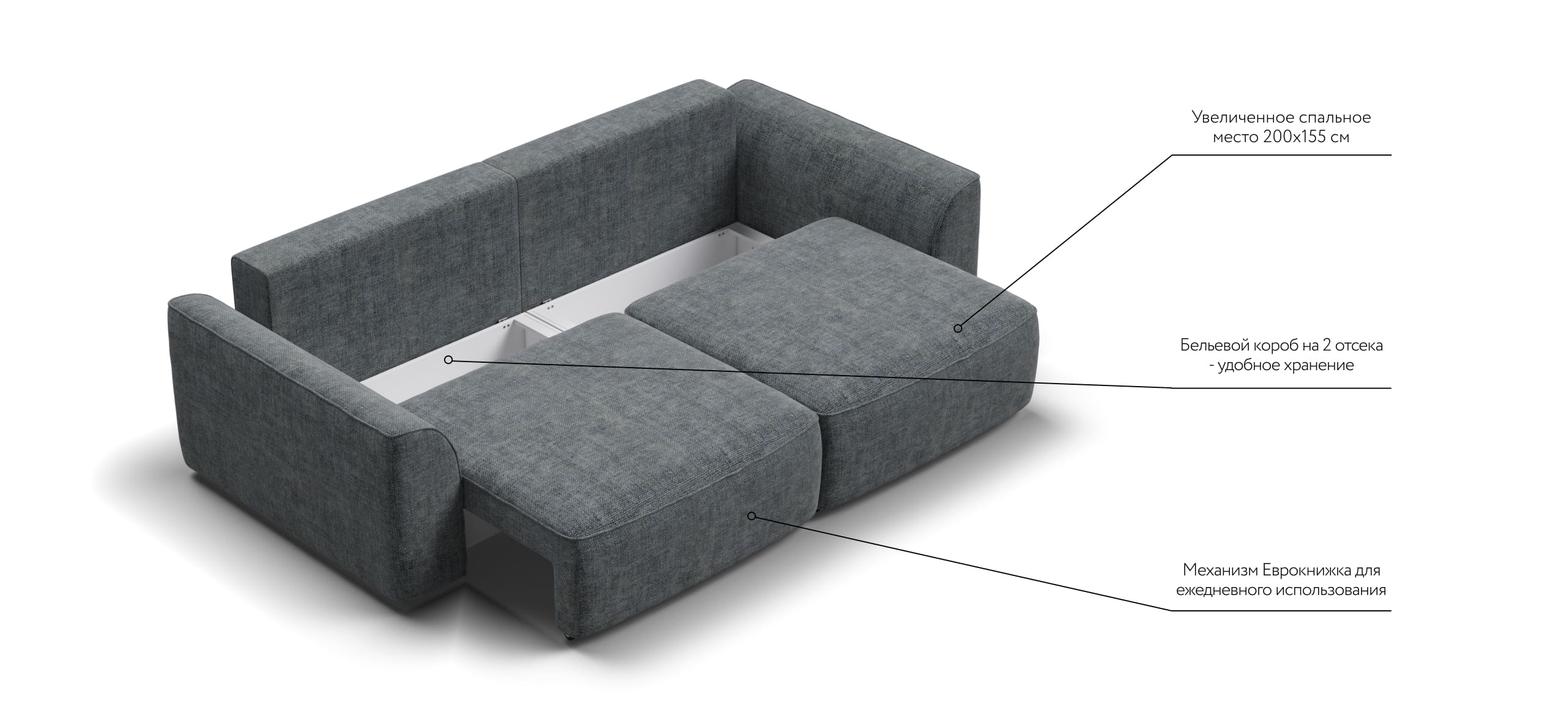 Комфортная посадка, скругленные линии, объемные подушки - диван, который наполнит ваш дом уютом и комфортом. Каждое посадочное место можно выдвинуть вперед и получить угловой диван, на котором с комфортом разместится небольшая компания. А в разложенном виде диван превращается в комфортное спальное место.