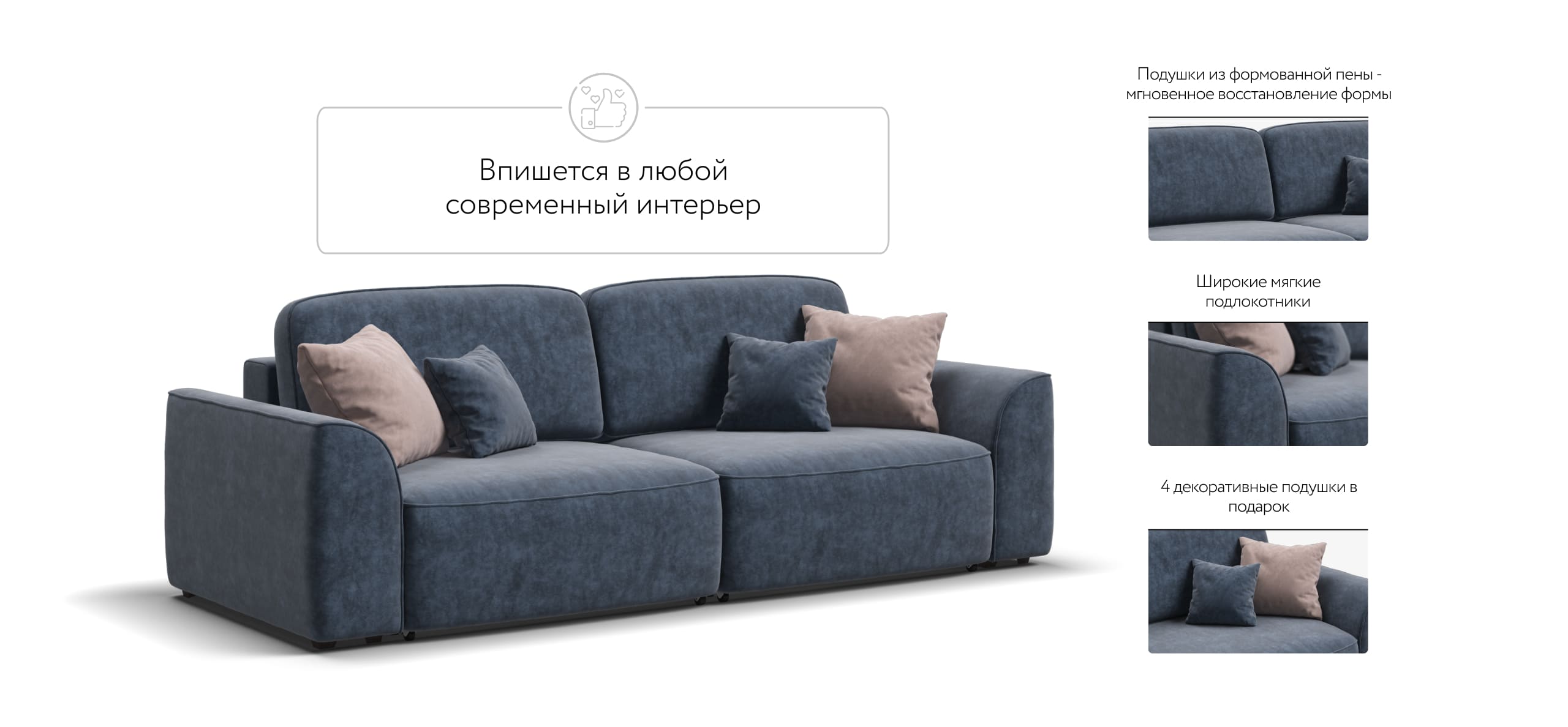 Комфортная посадка, скругленные линии, объемные подушки - диван, который наполнит ваш дом уютом и комфортом. Каждое посадочное место можно выдвинуть вперед и получить угловой диван, на котором с комфортом разместится небольшая компания. А в разложенном виде диван превращается в комфортное спальное место.