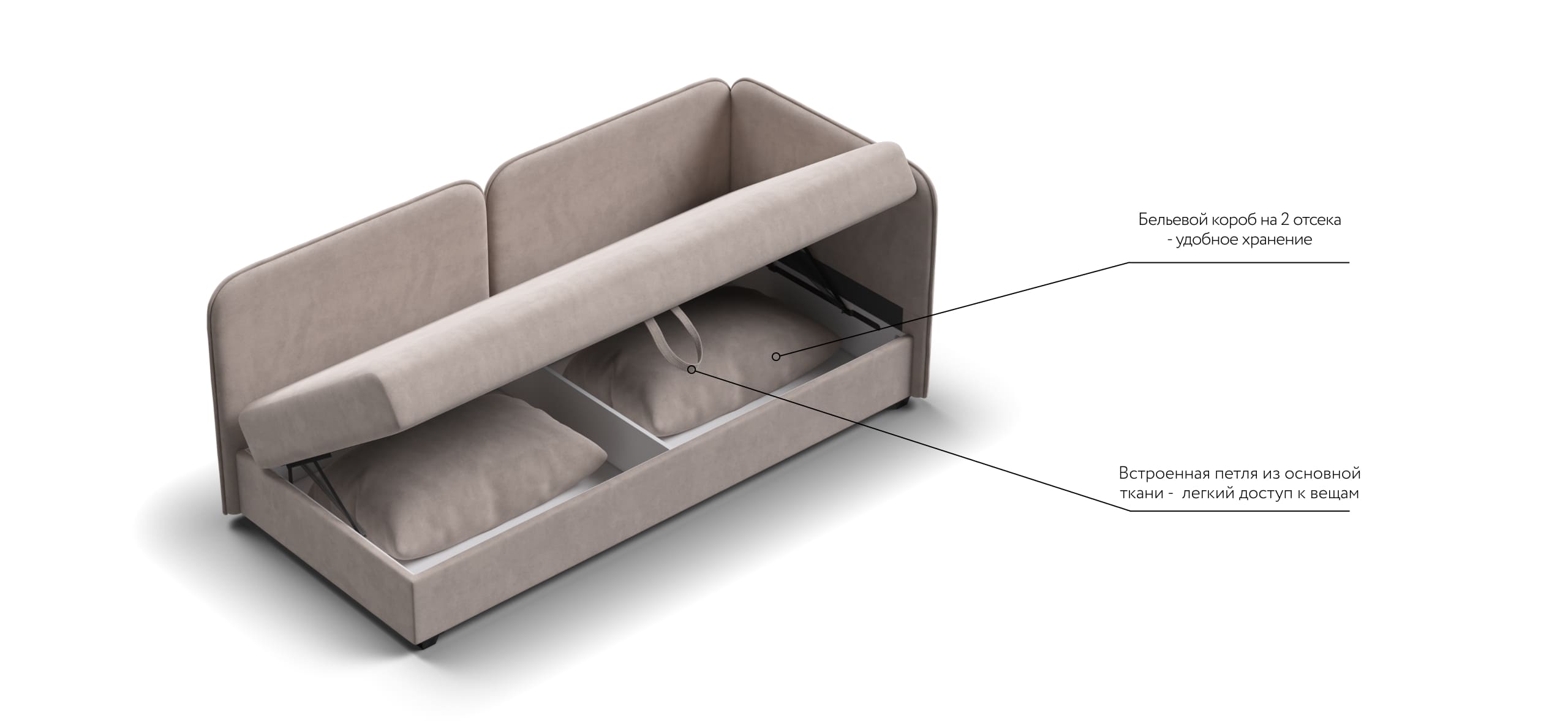 Вместительный бельевой короб в основании позволит Вам убрать на ночь приспинные подушки, а днем хранить постельные принадлежности.