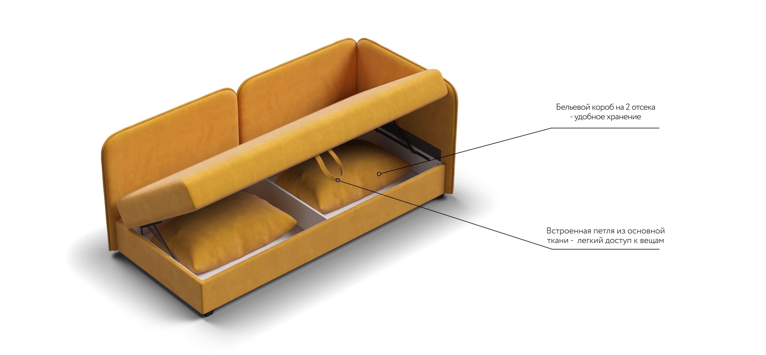 Вместительный бельевой короб в основании позволит Вам убрать на ночь приспинные подушки, а днем хранить постельные принадлежности.