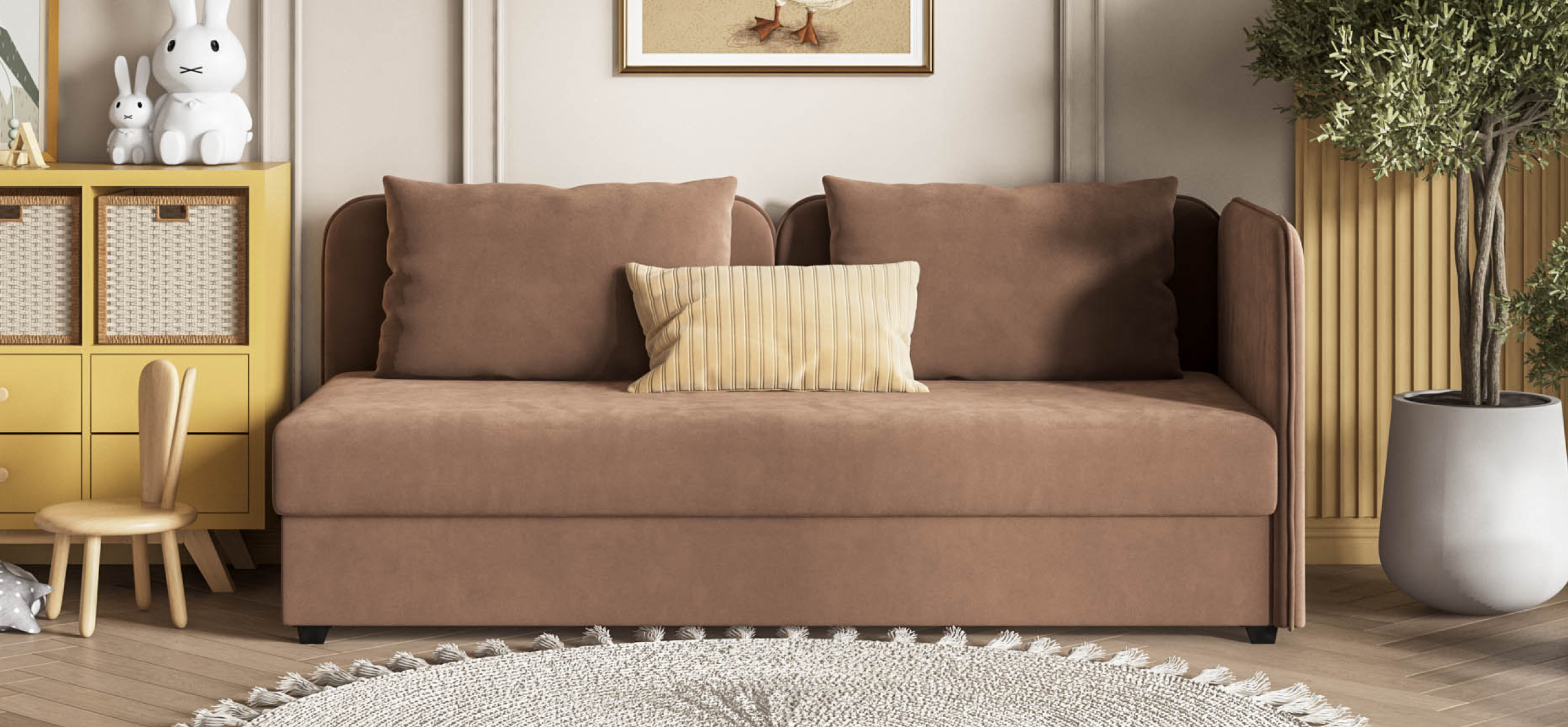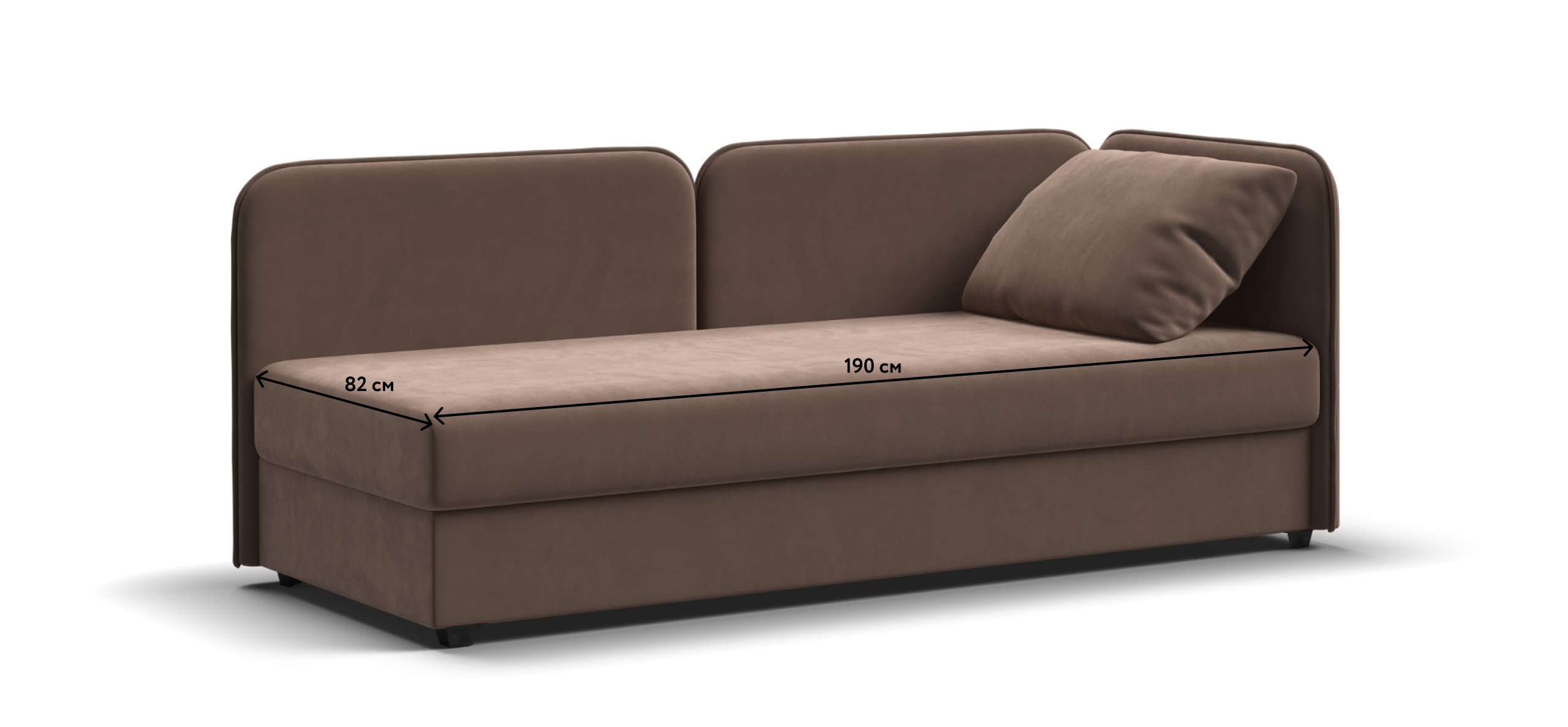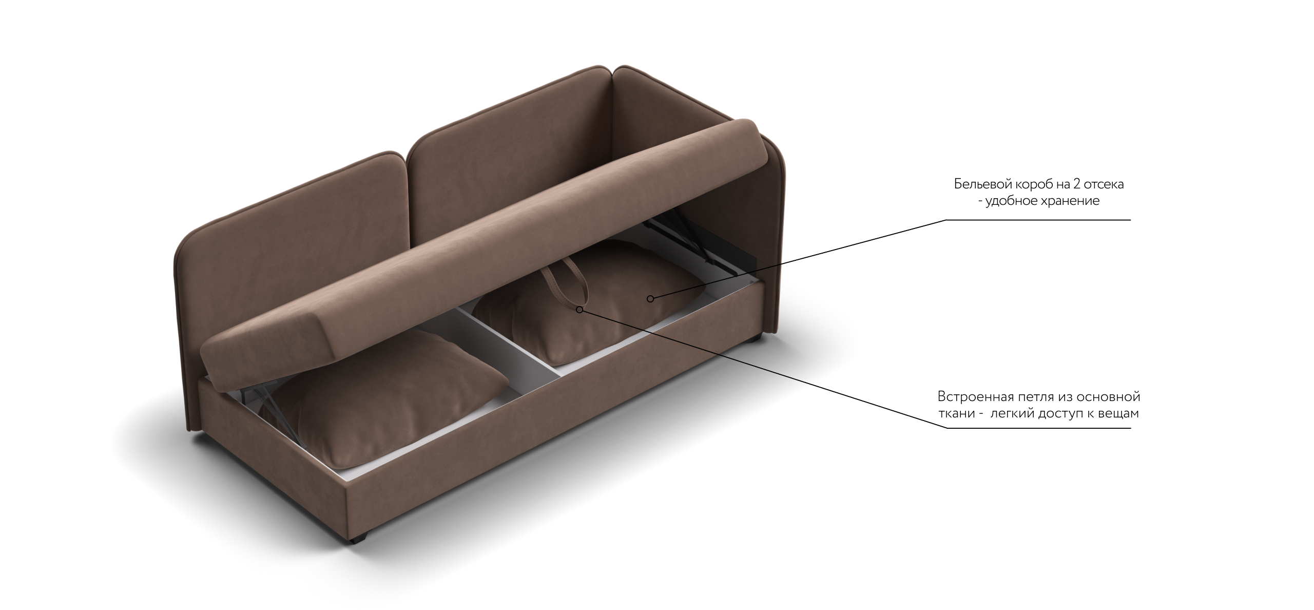 Вместительный бельевой короб в основании позволит Вам убрать на ночь приспинные подушки, а днем хранить постельные принадлежности.
