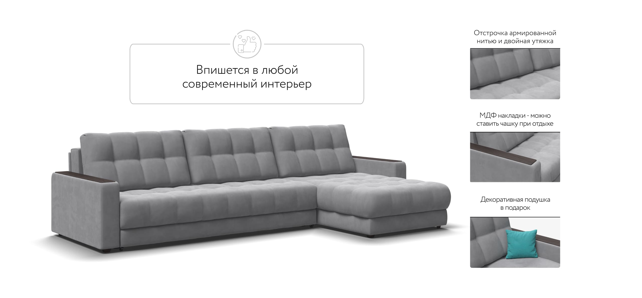 Декоративная строчка армированной нитью и двойная утяжка надолго сохранит внешний вид дивана.