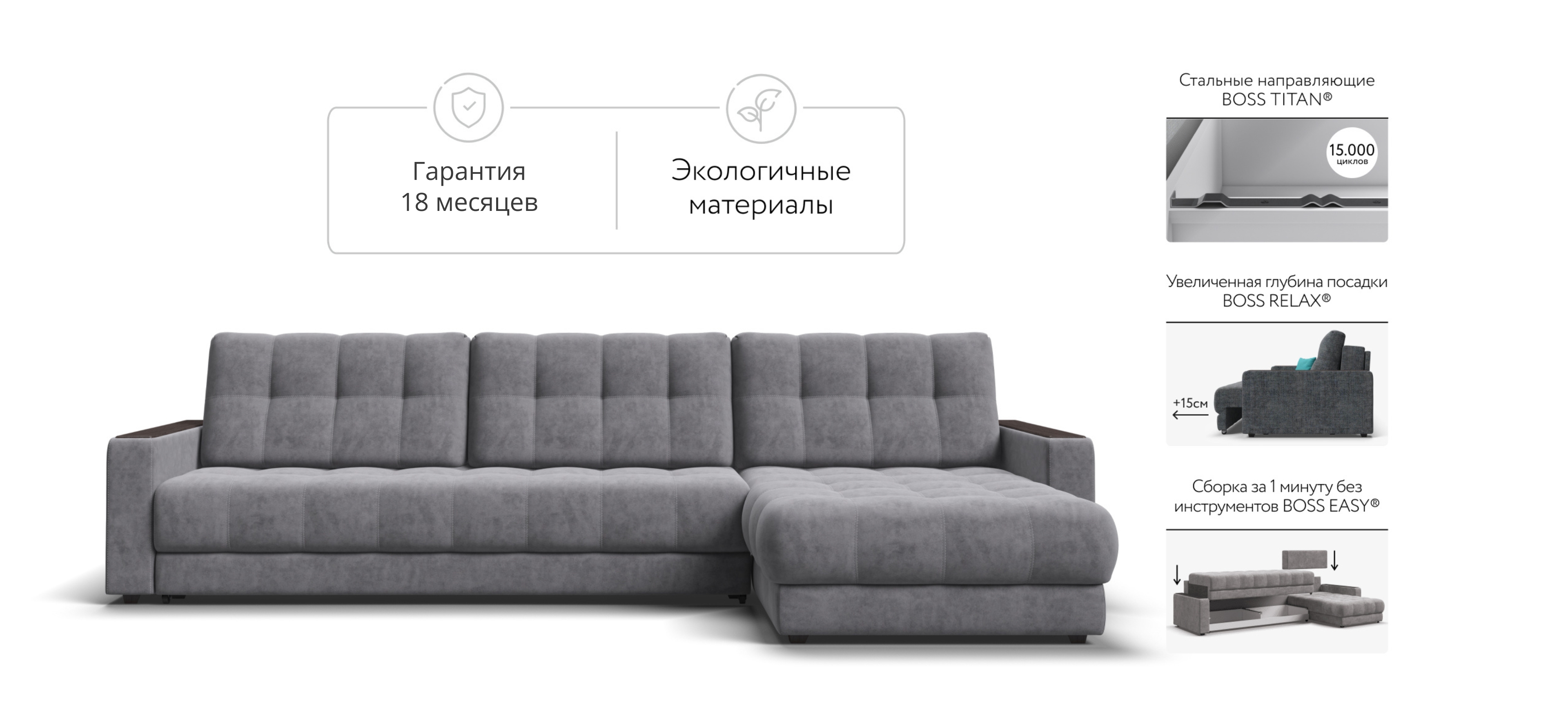 Продуманный до мелочей диван BOSS сочетает в себе надежный каркас, мягкие ткани, многофункциональность и быструю сборку за 1 минуту без инструментов - ощутите комфорт у себя дома!
