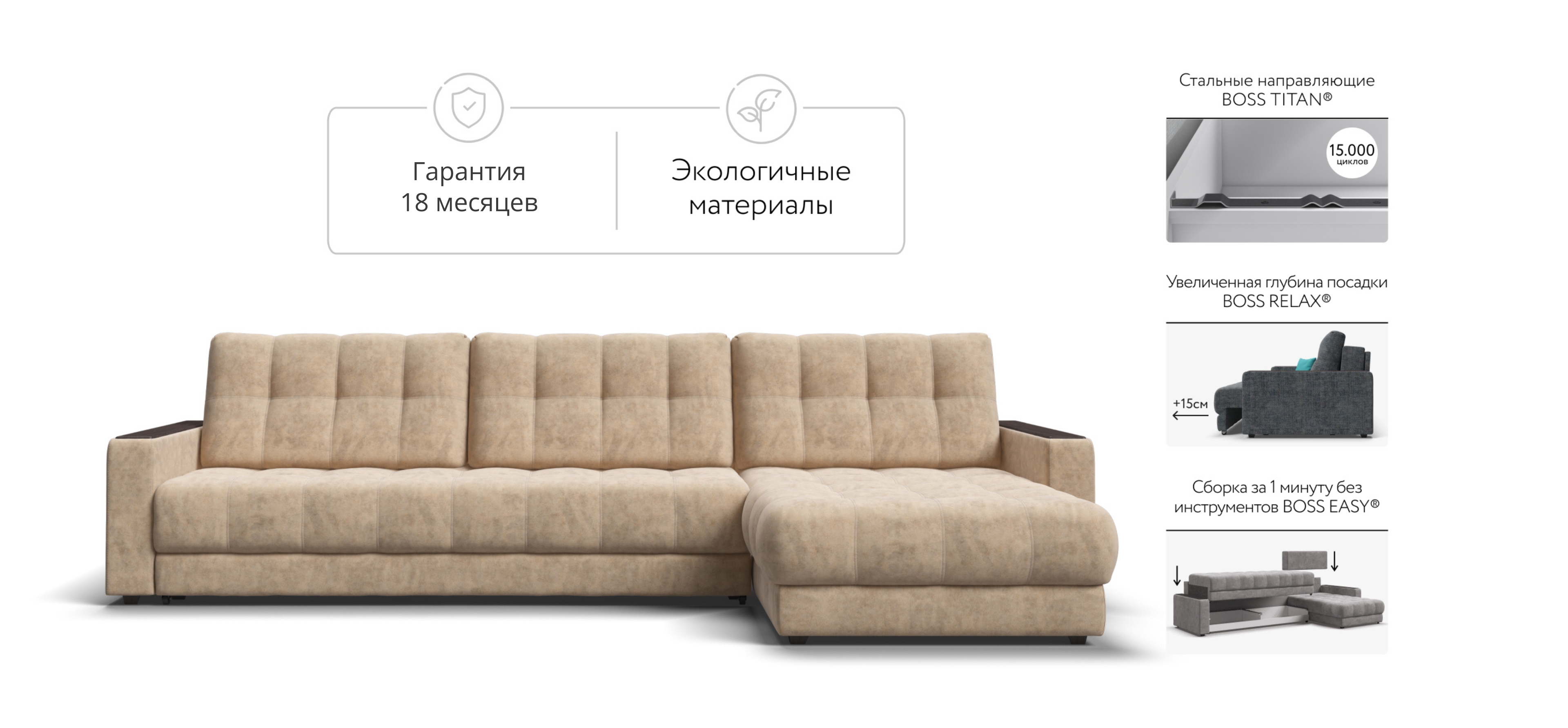 Продуманный до мелочей диван BOSS сочетает в себе надежный каркас, мягкие ткани, многофункциональность и быструю сборку за 1 минуту без инструментов - ощутите комфорт у себя дома!