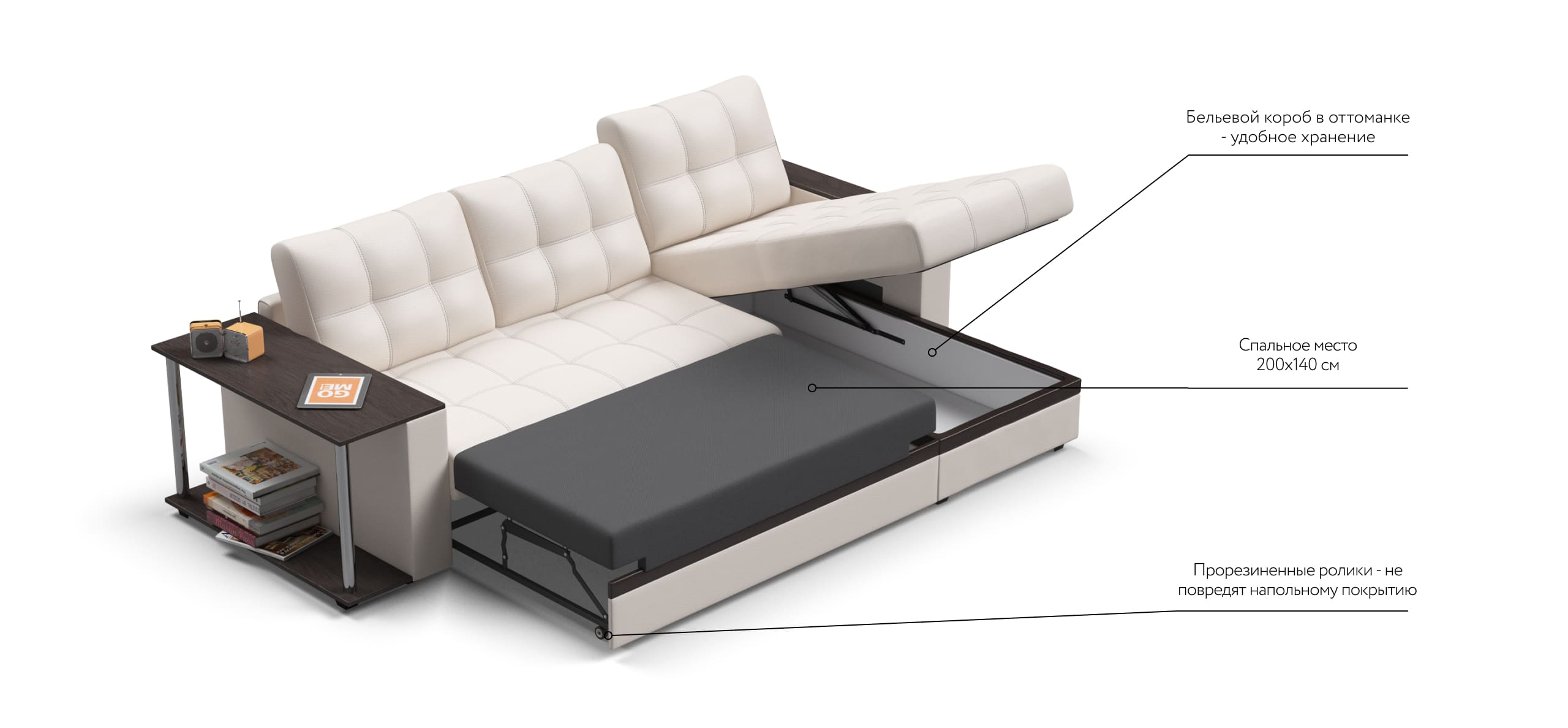 Модель оснащена прорезиненными колесиками, что обеспечит вам легкость раскладки и обезопасит от повреждений напольное покрытие. Не прилагая особых усилий, диван легко превратить в комфортную двуспальную кровать с идеально ровным спальным местом.