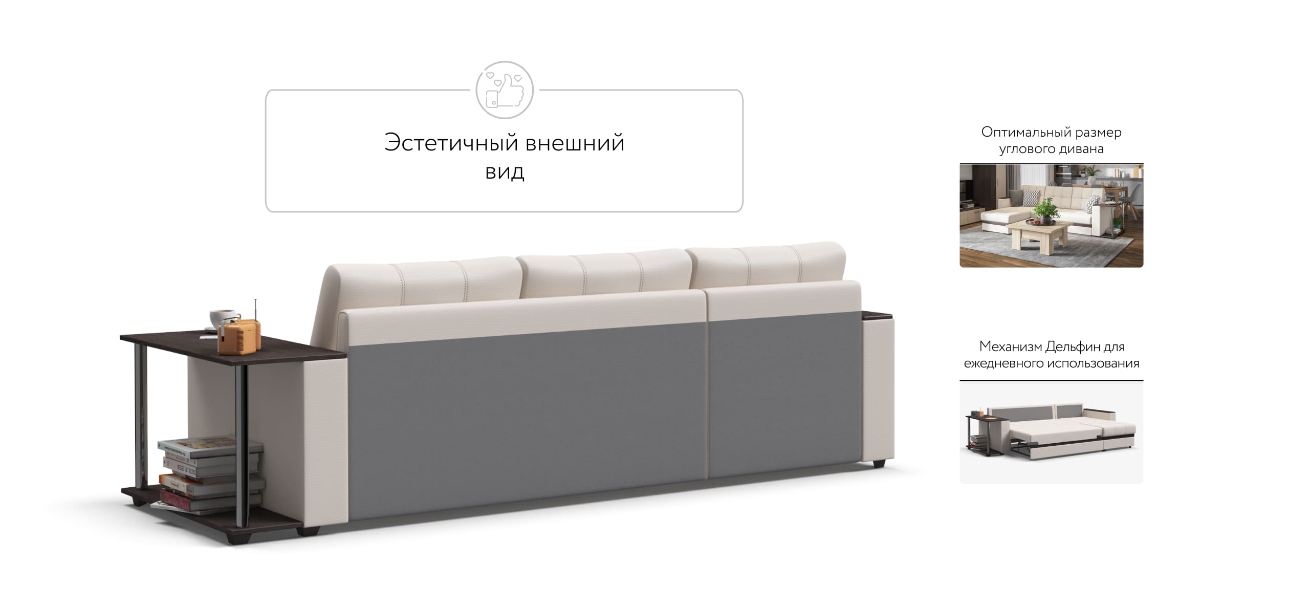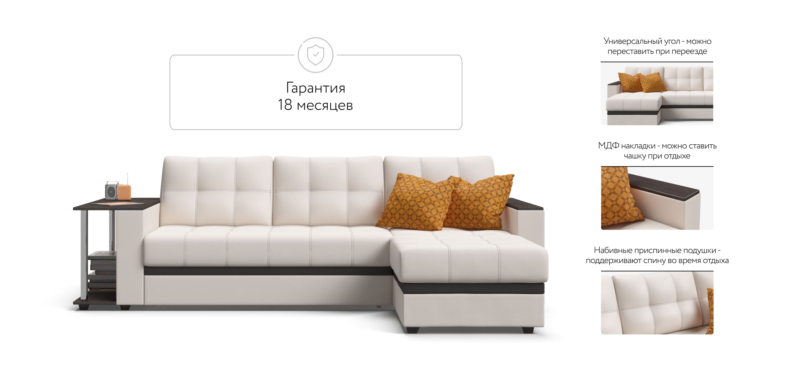 Угловой диван Атланта, благодаря своему элегантному и практичному дизайну, замечательно дополнит интерьер Вашей гостиной. Надежный и простой механизм трансформации дельфин идеален для постоянного использования и выдерживает большие нагрузки.