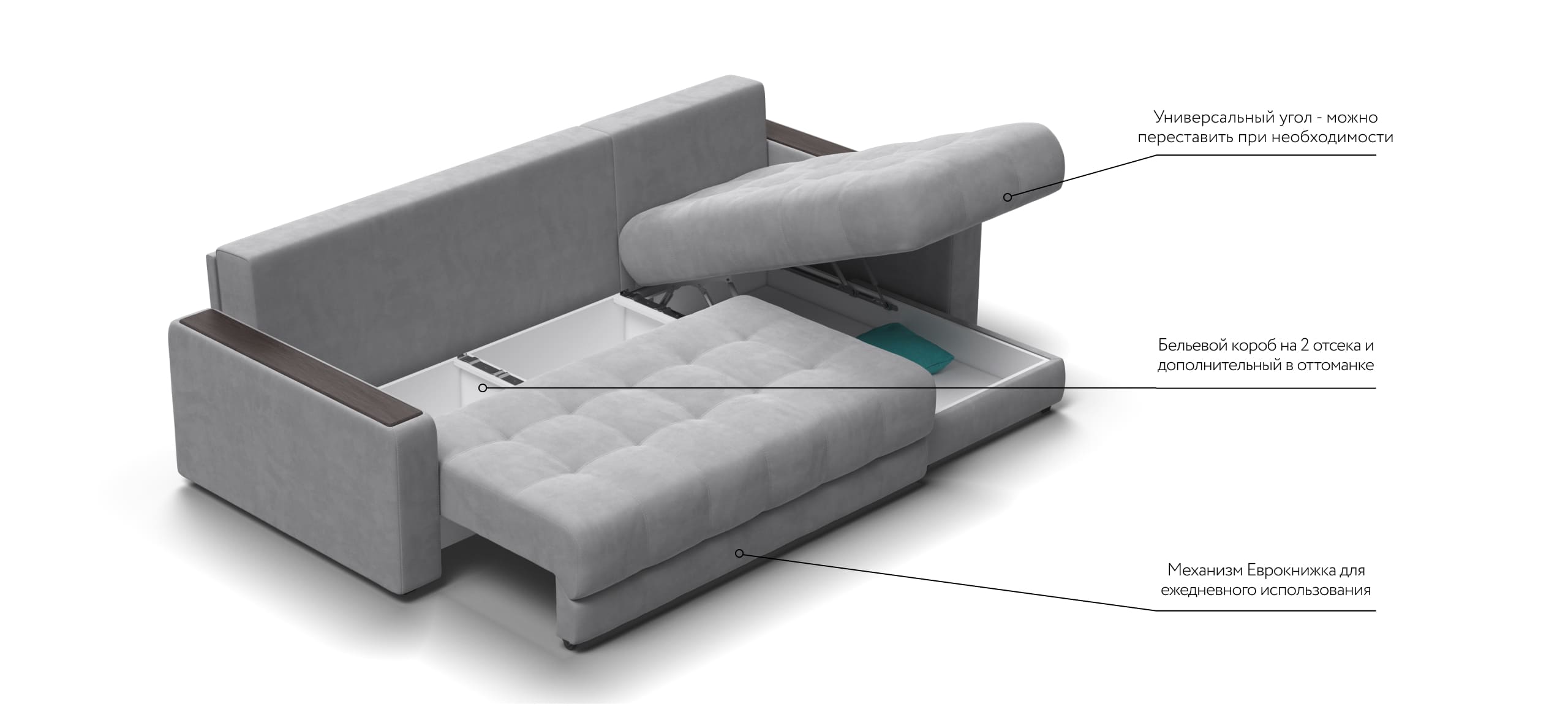 Угловой диван BOSS Classic XL - диван с подъемной оттоманкой и механизмом Еврокнижка.