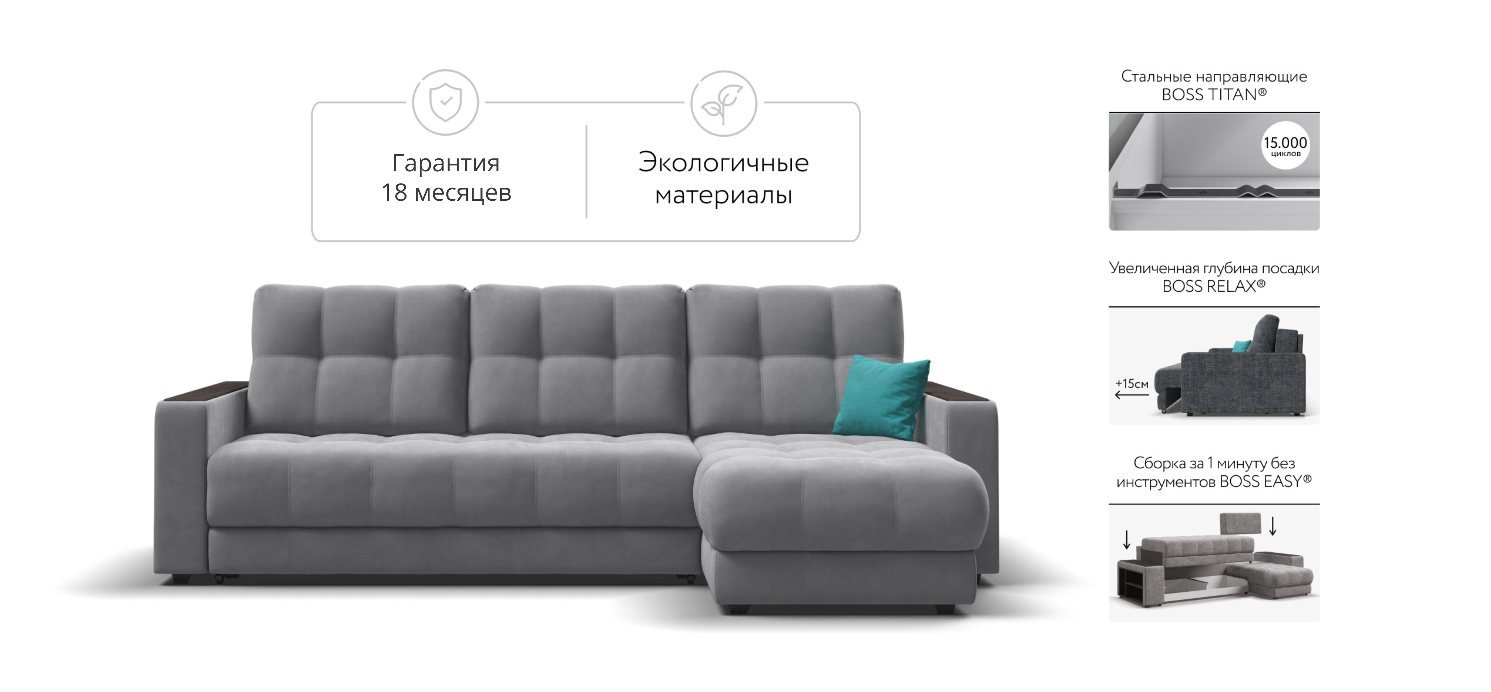 Продуманный до мелочей диван BOSS сочетает в себе мягкие ткани, надежный каркас, качественное наполнение матраса и быструю сборку за 1 минуту без инструментов - ощутите комфорт у себя дома!