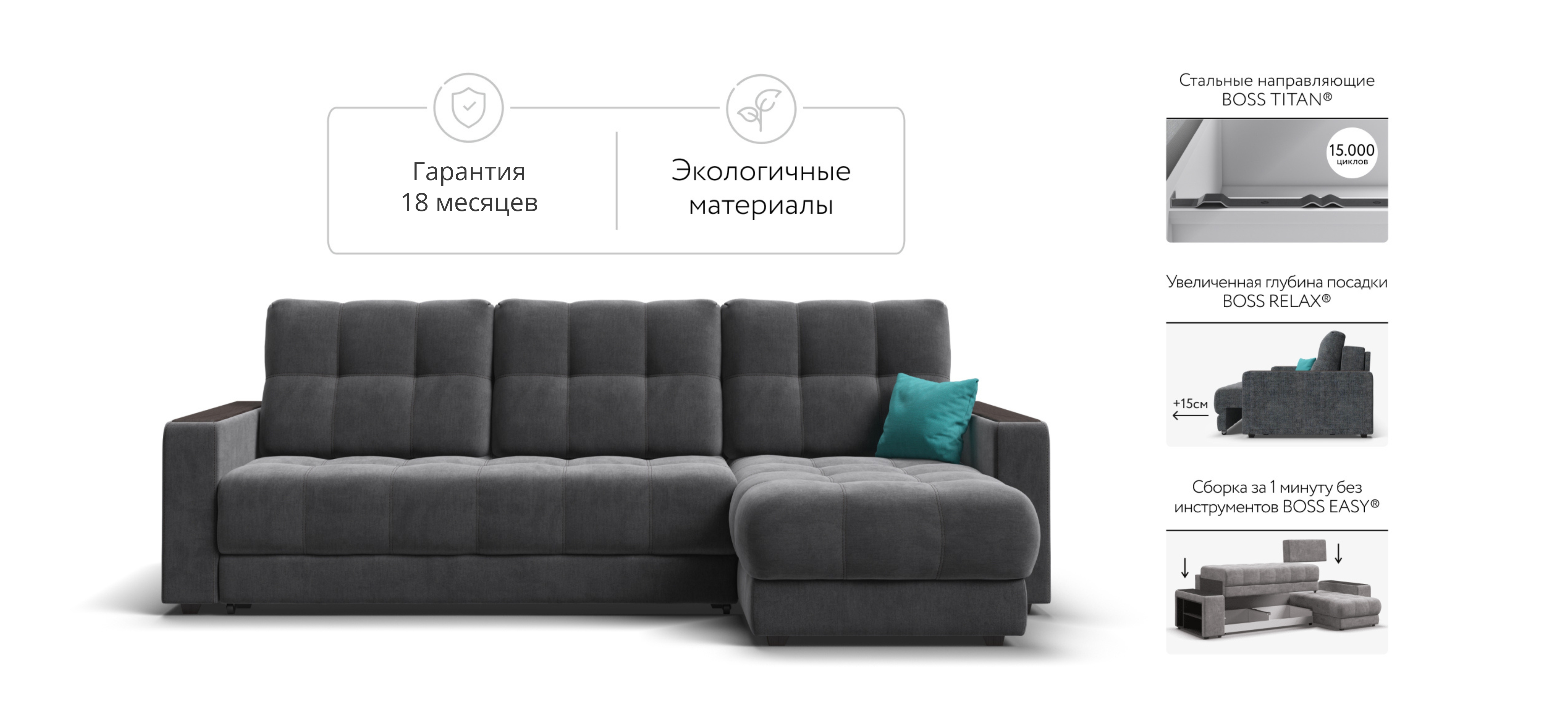 Продуманный до мелочей диван BOSS сочетает в себе мягкие ткани, надежный каркас, качественное наполнение матраса и быструю сборку за 1 минуту без инструментов - ощутите комфорт у себя дома!