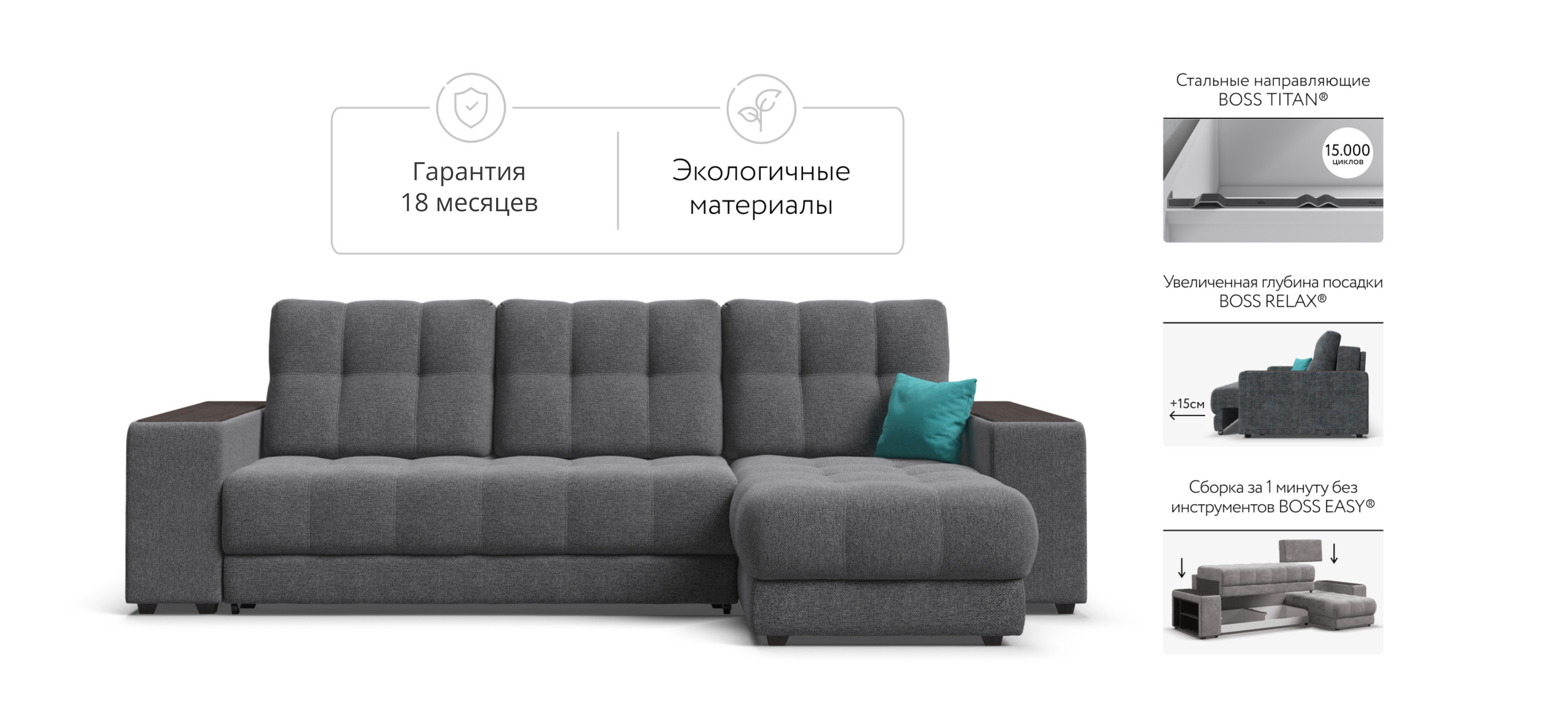 Продуманный до мелочей диван BOSS сочетает в себе функциональный подлокотник, мягкие ткани, надежный каркас, качественное наполнение матраса и быструю сборку за 1 минуту без инструментов - ощутите комфорт у себя дома!