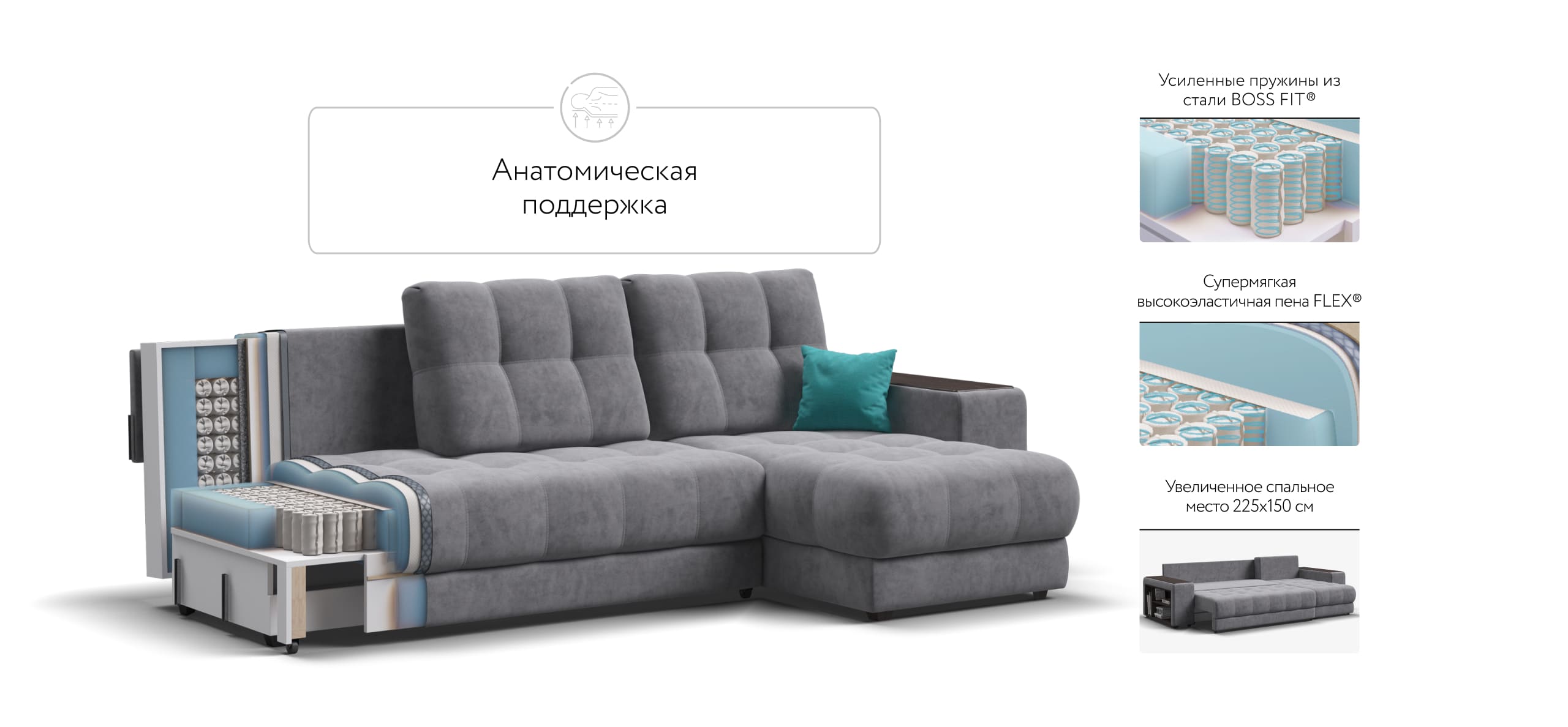 Продуманный до мелочей диван BOSS сочетает в себе функциональный подлокотник, мягкие ткани, надежный каркас, качественное наполнение матраса и быструю сборку за 1 минуту без инструментов - ощутите комфорт у себя дома!
