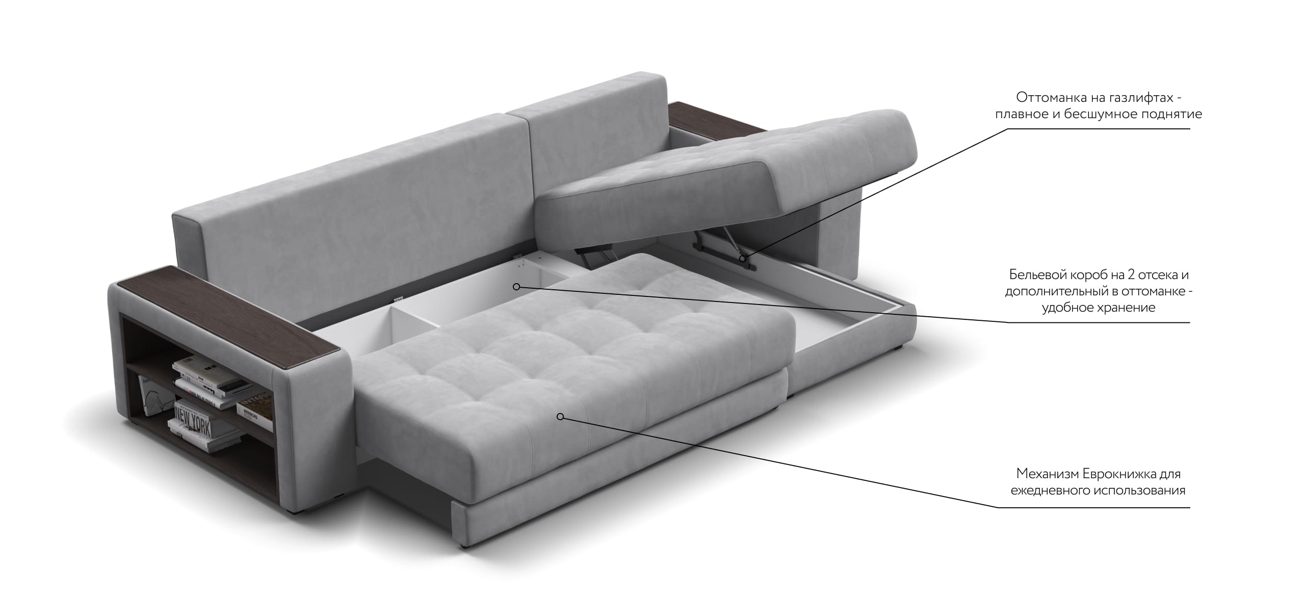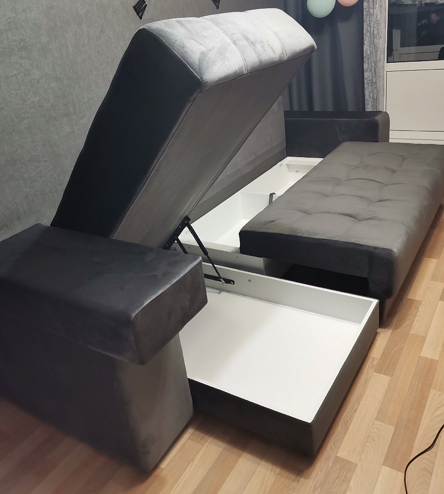 Надежный механизм трансформации еврокнижка сделает Дубай достойной альтернативой традиционной кровати. В основании дивана размещены большие и удобные бельевые ящики.