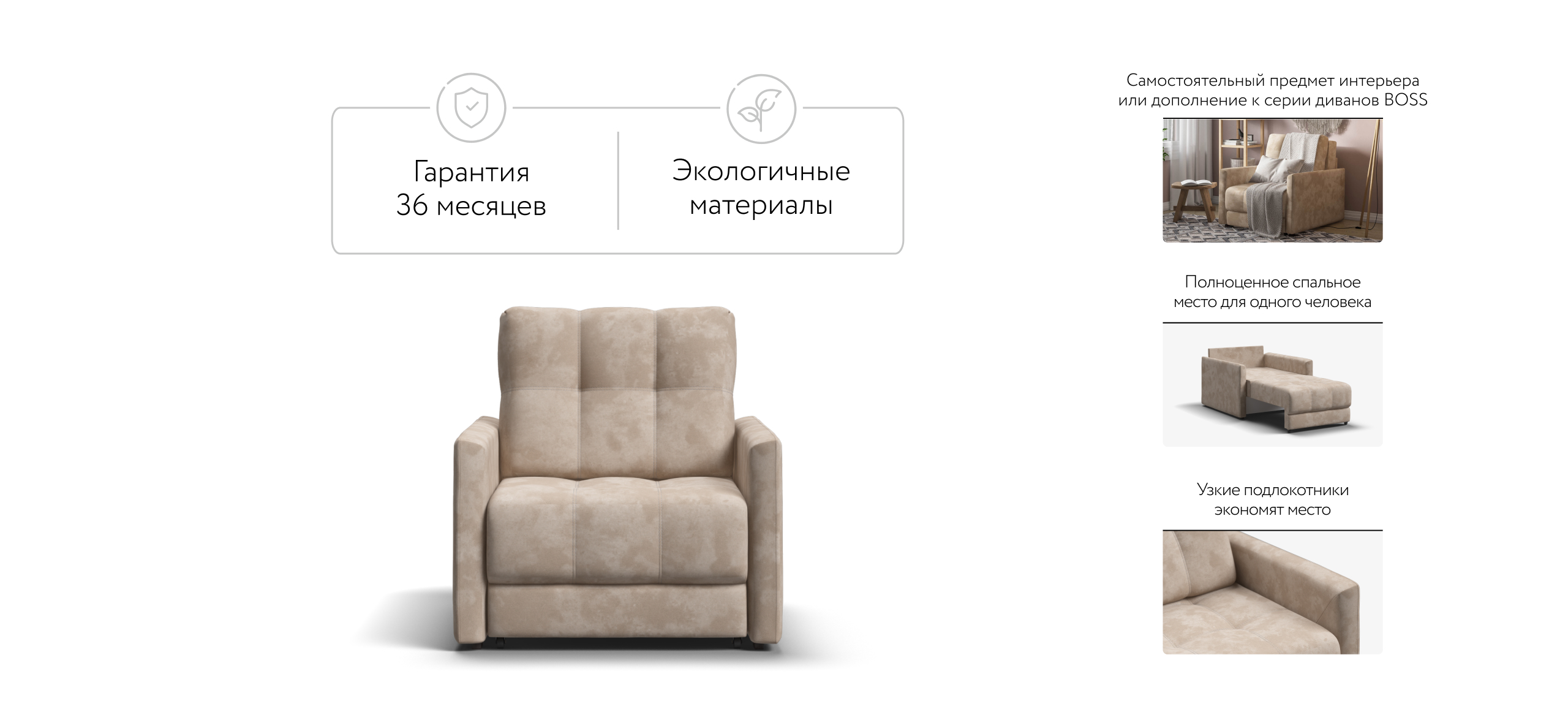 BOSS LOFT кресло-кровать - идеальное дополнение к дивану BOSS LOFT, отлично сочетает в себе две функции: подарит комфортный отдых днем и даст полноценное спальное место для гостя, который решил остаться у вас на ночь. Тонкие подлокотники идеальны для тех, кто ищет не классическое решение для своего интерьера.