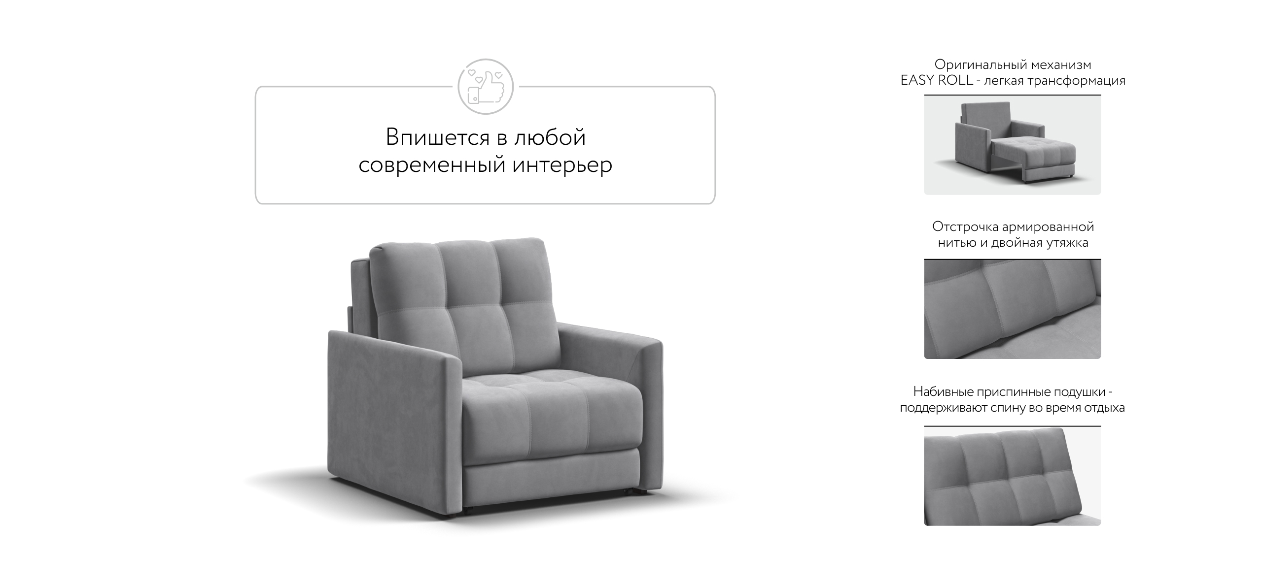 BOSS LOFT кресло-кровать - идеальное дополнение к дивану BOSS LOFT, отлично сочетает в себе две функции: подарит комфортный отдых днем и даст полноценное спальное место для гостя, который решил остаться у вас на ночь. Тонкие подлокотники идеальны для тех, кто ищет не классическое решение для своего интерьера.