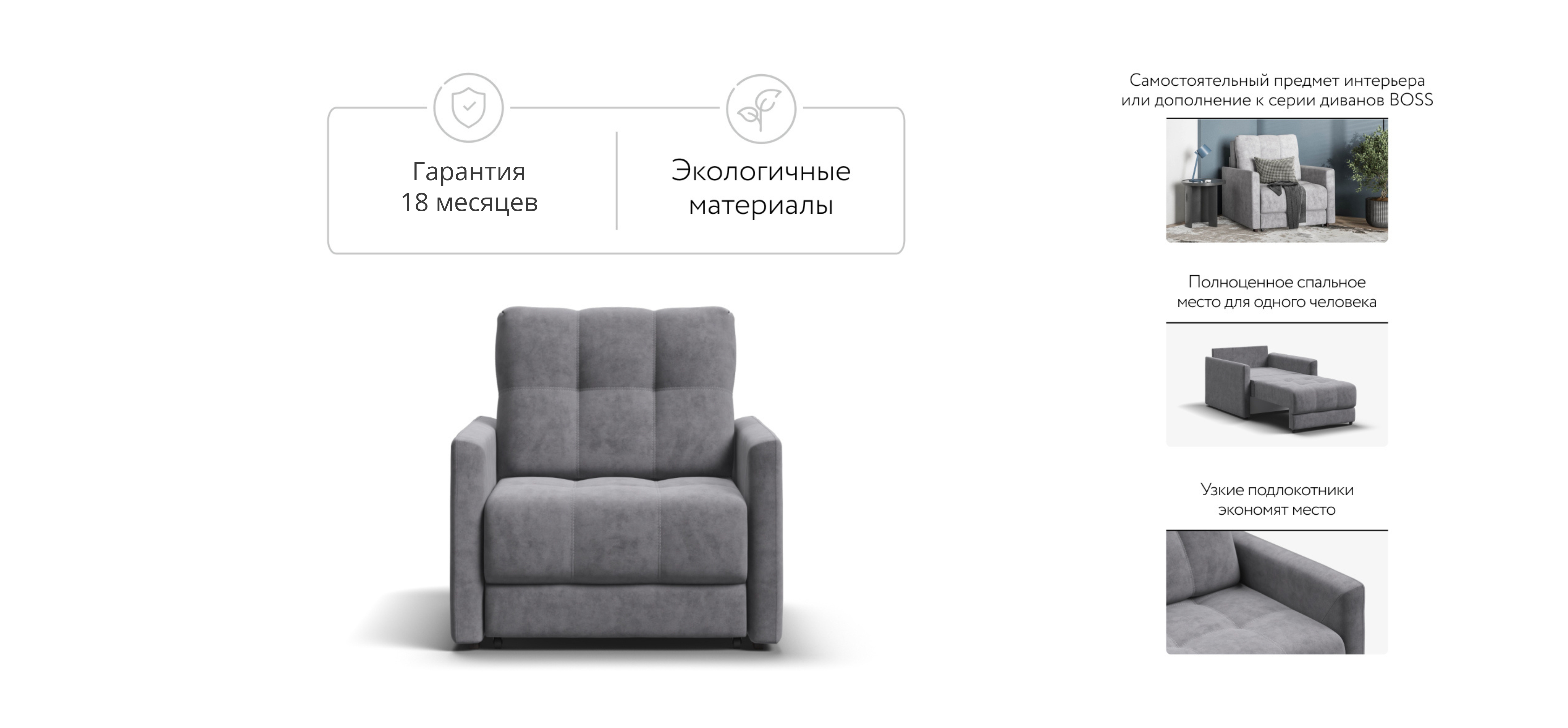 BOSS LOFT кресло-кровать - идеальное дополнение к дивану BOSS LOFT, отлично сочетает в себе две функции: подарит комфортный отдых днем и даст полноценное спальное место для гостя, который решил остаться у вас на ночь. Тонкие подлокотники идеальны для тех, кто ищет не классическое решение для своего интерьера.
